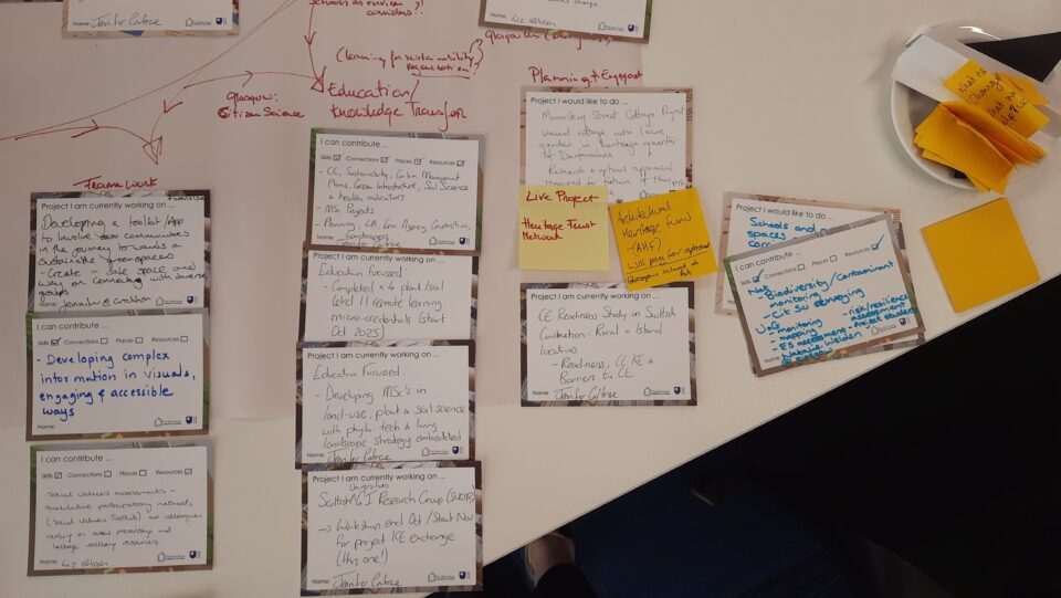 Sounds simple, yet watching it happen was quite something. People were discussing their project cards with similar ones, placing their “I can contribute” cards next to projects that interested them. A community heritage group mentioned their knowledge of local history, and suddenly an ecologist realised this could be crucial for understanding why certain restoration approaches might work or fail in specific locations. Someone working on innovative financing models connected with a heritage manager looking for new funding approaches.