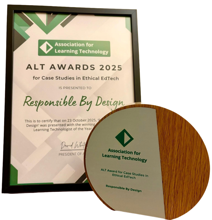 We are incredibly proud to be joint winners of the Ethical EdTech Award category at the Association for Learning Technology conference 2025. Our AI group do incredible work, and it is a real honour for them to be recognised and celebrated for their impact. Openness is a core value of our work, and our award-winning Responsible by Design (RBD) approach is freely available for you to access and use in your context (see the resources section below to access RBD – RBD is also highlighted by Burvill et al., (2025)).