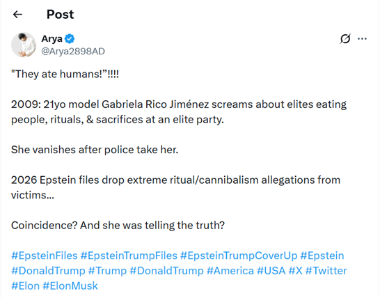 Another document, since withdrawn, has Trump present as babies are killed, and girls being strangled in full view of guests and buried under the golf course in Mar-A-Lago. It is worth noting however that these supposedly took place at parties, not in religious rituals. And while there are around fifty mentions of “cannibal” or “cannibalism” among the three million files, none of them are allegations that it happened. That doesn’t stop posters like the one below from extrapolating it from earlier (equally flimsy) accusations however.