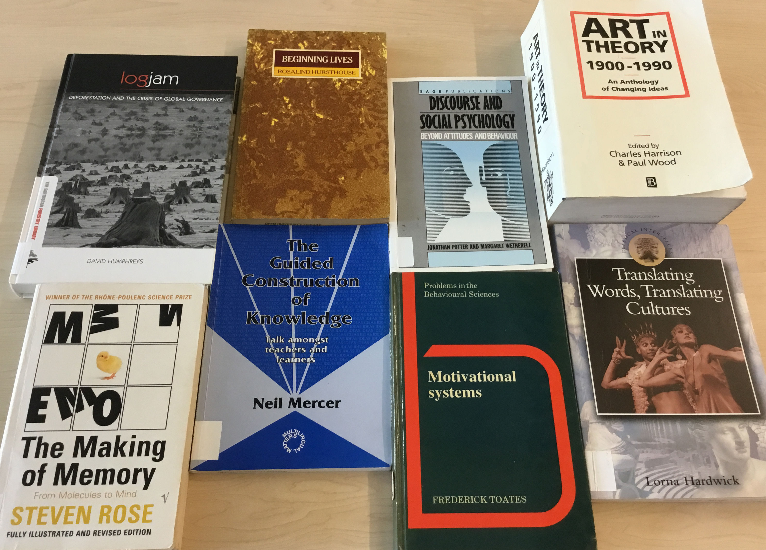 Since the very beginning of the University, academic staff and researchers have published their findings and promoted their research via many methods, and in many formats. Some of these publications have gone on to become well-established paradigm texts in their field – and a very small selection of these from The Open University Library’s book stock are shown in the image on this page. Some such texts have also been included in OU courses over the years as set books.
