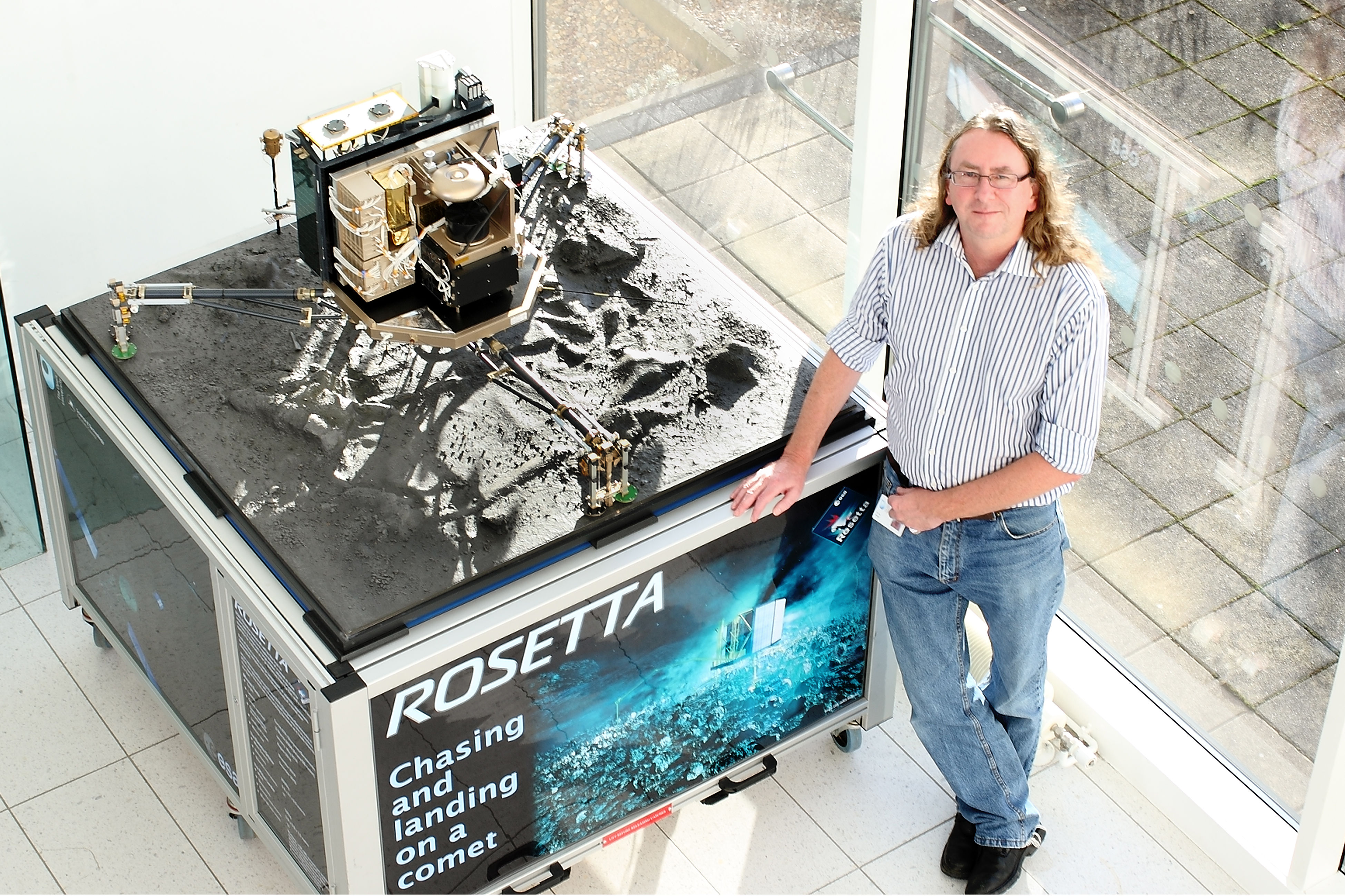 The University’s involvement in ground-breaking space exploration research continued with the development of Ptolemy: a gas chromatography–mass spectrometer instrument designed to measure chemical aspects on comets. Ptolemy was housed on the Philae Lander as part of the European Space Agency’s Rosetta mission – launched in 2004, it finally landed on the target comet 67P/Churyumov-Gerasimenko in August 2014. The photograph on this page shows Professor Ian Wright who was the principal investigator leading on the creation of Ptolemy, alongside a model of the Philae Lander.