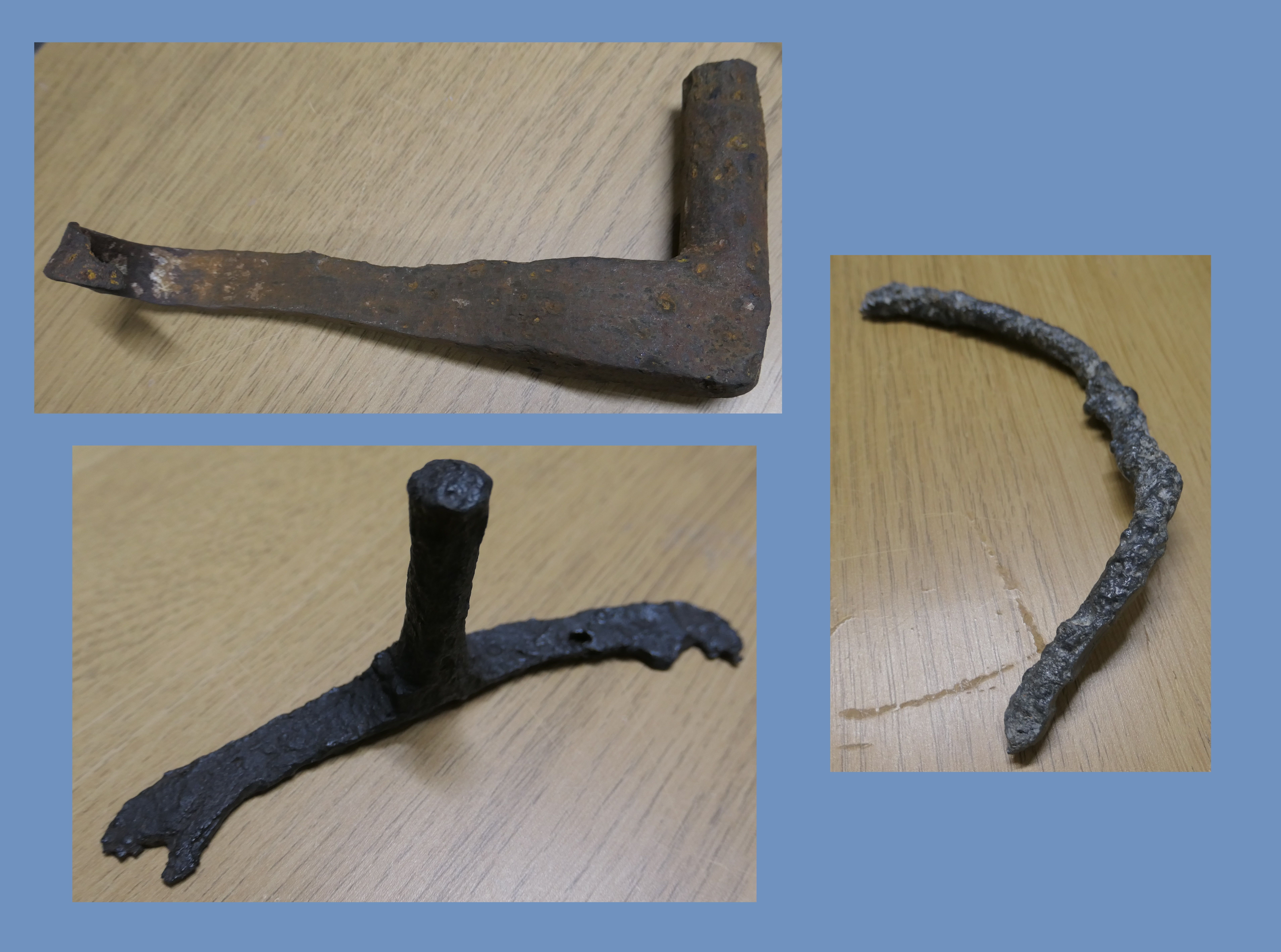 The second image shows three metal objects: an unidentified iron object - possibly part of a door hinge, an iron trivet and a lead handle. Their dates are unknown. The third image shows a decorated bronze or copper book clasp dating from the late seventeeth century. It is similar to the book clasps found on large eighteenth and nineteenth century church service and prayer books or family Bibles.