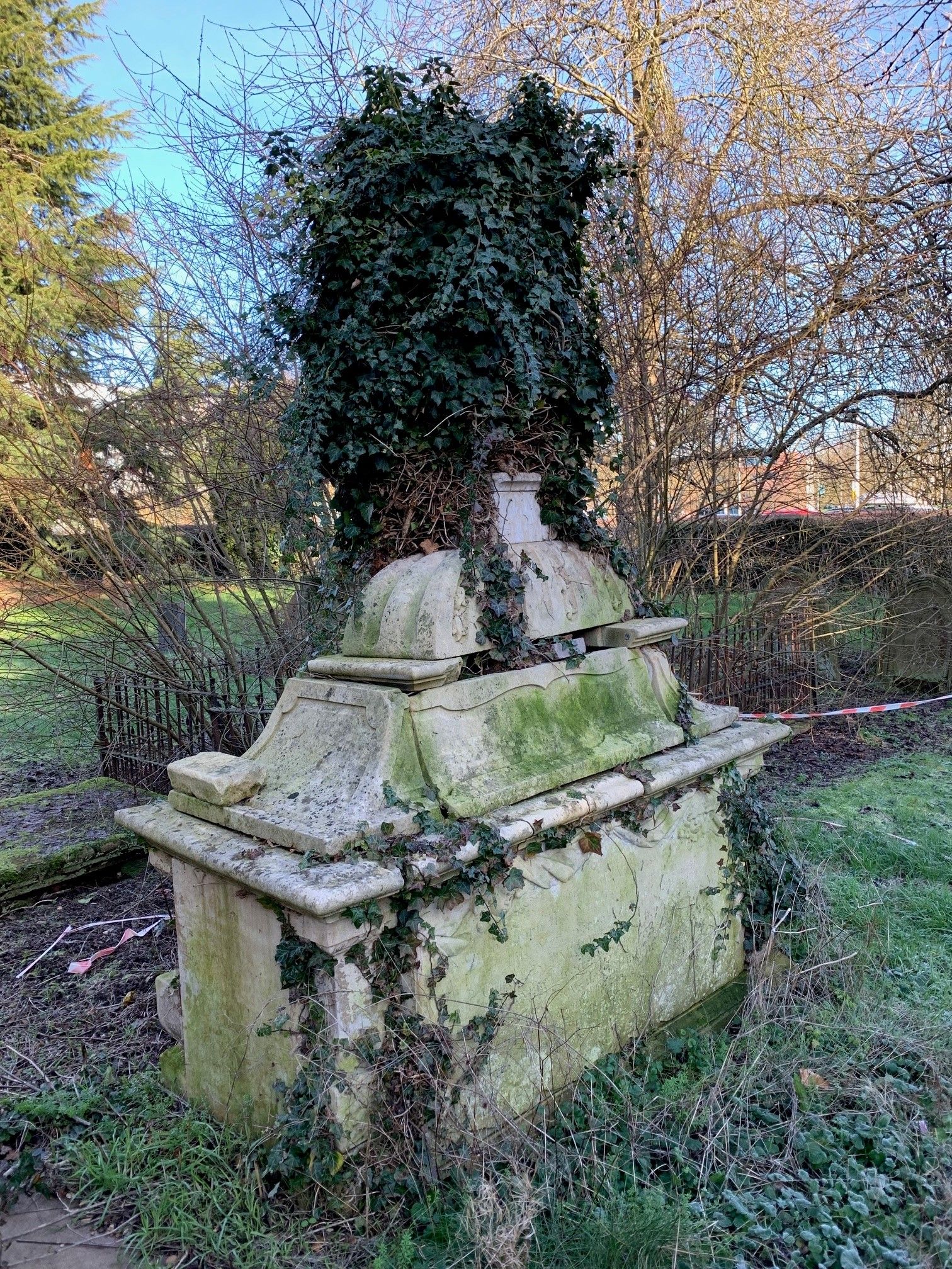 In January 2022 the Pinfold Tomb was ‘rediscovered’ in St Michael’s churchyard at Walton Hall by the Archive team. It was totally encased in ivy and all traces of the stonework were hidden. The Open University Estates Grounds Team began removing the ivy and revealed the monument beneath in February 2022. The first image on this page shows the tomb in early 2023. The second image shows St Michael's Church photographed in about 1999 with the Pinfold Tomb, as it looked then, situated on the far right.