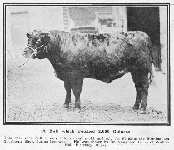 In 1911 Dr Harley was elected a member of the council of the Shorthorn Society and served on it until his death. He was Vice-President in 1917 and subsequently President in 1918. He was also a member of the Shire Horse, Oxford Downs, and Large Black Pig Societies. Over a twenty year period the local newspapers contained news of the sales of Vaughan Harley’s farm stock and his frequent prize winnings at Agricultural shows. His most successful year came in 1918 when he won the Championship, Reserve Championship and MacLennan Cup at the Birmingham Spring Show. At the same show Dr Harley sold the reserve show champion - a 15 month Shorthorn Bull - for a record show price of more than 2000 guineas. A photograph of the bull taken from 'The Sphere' newspaper can be viewed on this page. Dr Harley's champion bull was sold for 1600 guineas and both animals were transported for breeding to Argentina.