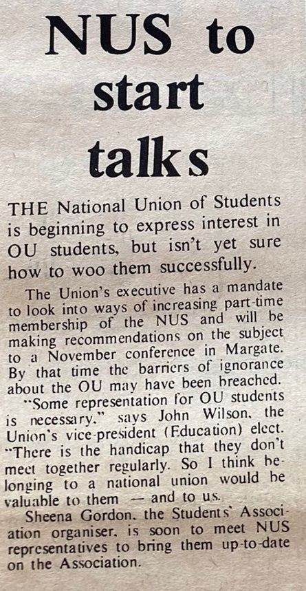 Even though NUS were keen to engage Open University students as they could help to achieve the NUS mandate, which included increasing their part-time student membership numbers, they were concerned that OU students didn’t come together regularly enough. Even when Conference became a regular feature in the Students Association’s calendar, an agreement could not be reached, and OU students didn’t gain formal affiliation with the Union for a further 30 years.