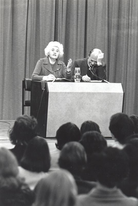 Jennie Lee addressing the audience of her lecture "The Conception and Birth of the OU". Vice-Chancellor Walter Perry sits next to her.