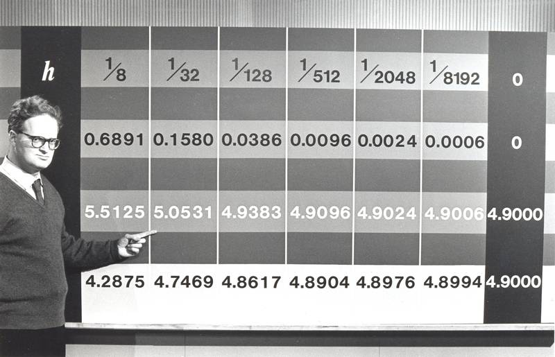 Open University television presenter (Dr. Alex Graham) indicating to a mathematics chart.