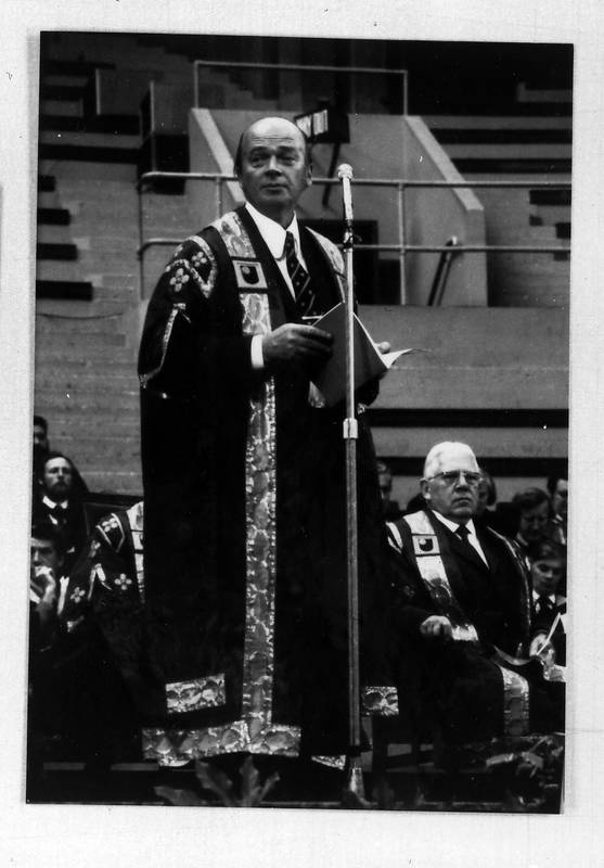 Vice-Chancellor Walter Perry at a graduation ceremony. In the background to the right can also be seen Pro-Chancellor Sir Peter Venables.