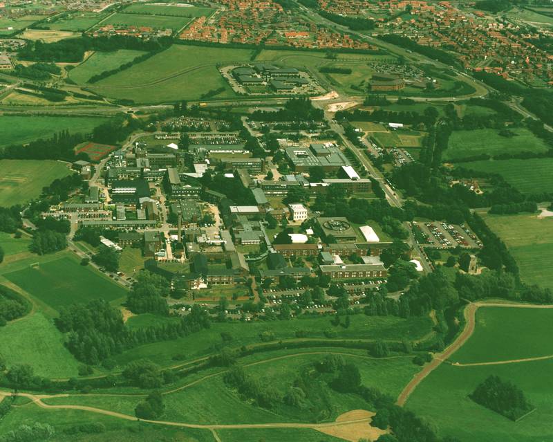 Aerial view of the Open University Walton Hall campus, approaching from the west, looking from Stuart Hall building to the junction of H9/V10.