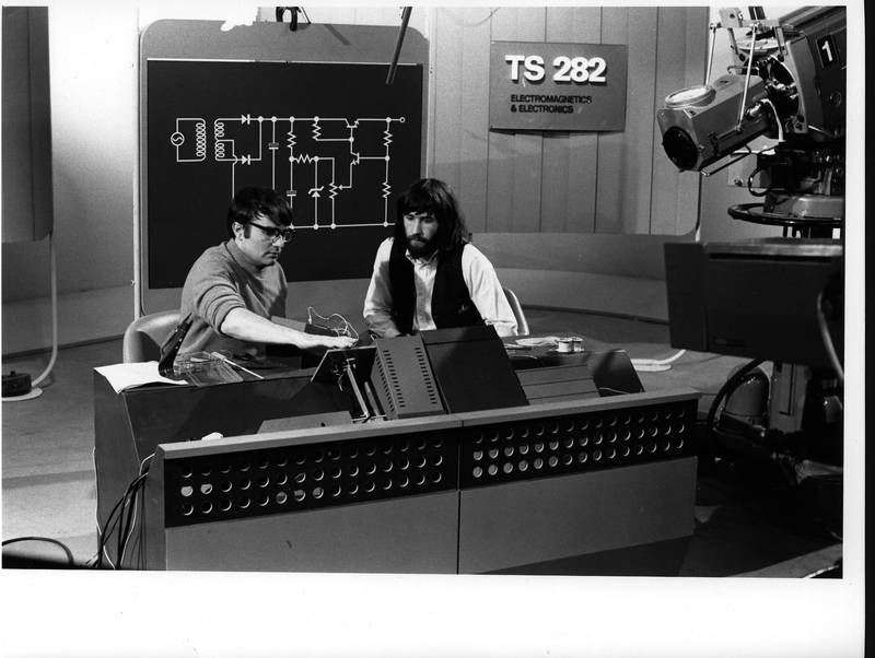 Open University presenters Dennis Moss (left) and Peter Chapman (right) working on the set for a programme for module TS282 Electromagnetics and Electronics.