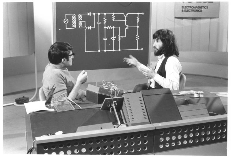 Open University presenters Dennis Moss (left) and Peter Chapman (right) working on the set for a programme for module TS282 Electromagnetics and Electronics.