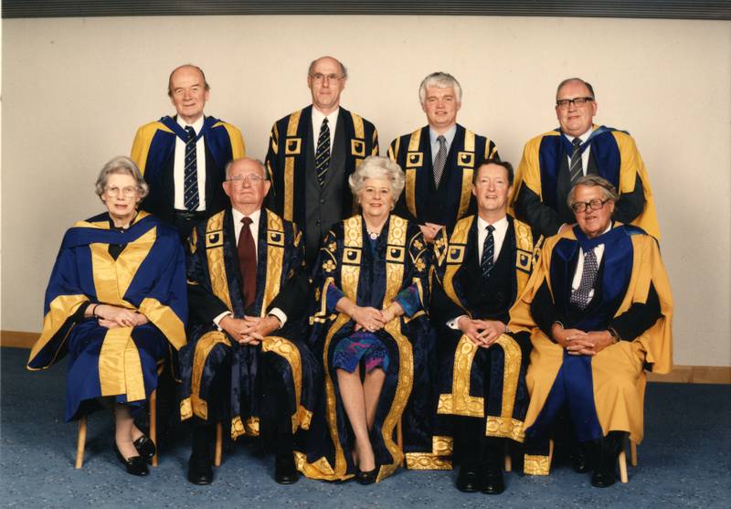 Senior OU staff on the occasion of the installation of Betty Boothroyd as Chancellor at the Open University Degree Ceremony held at Birmingham on 18th March 1995 Back row L-R: Lord Walter Perry (Former Vice Chancellor), Joe Clinch (University Secretary), Keith Todd (University Treasurer), Sir John Horlock (Former Vice Chancellor). Front row L-R: Baroness Carnegie of Lour, Sir Kenneth Berrill (Pro Chancellor), Baroness Betty Boothroyd (Chancellor), Sir John Daniel (Vice Chancellor), Lord Asa Briggs (Former Chancellor).