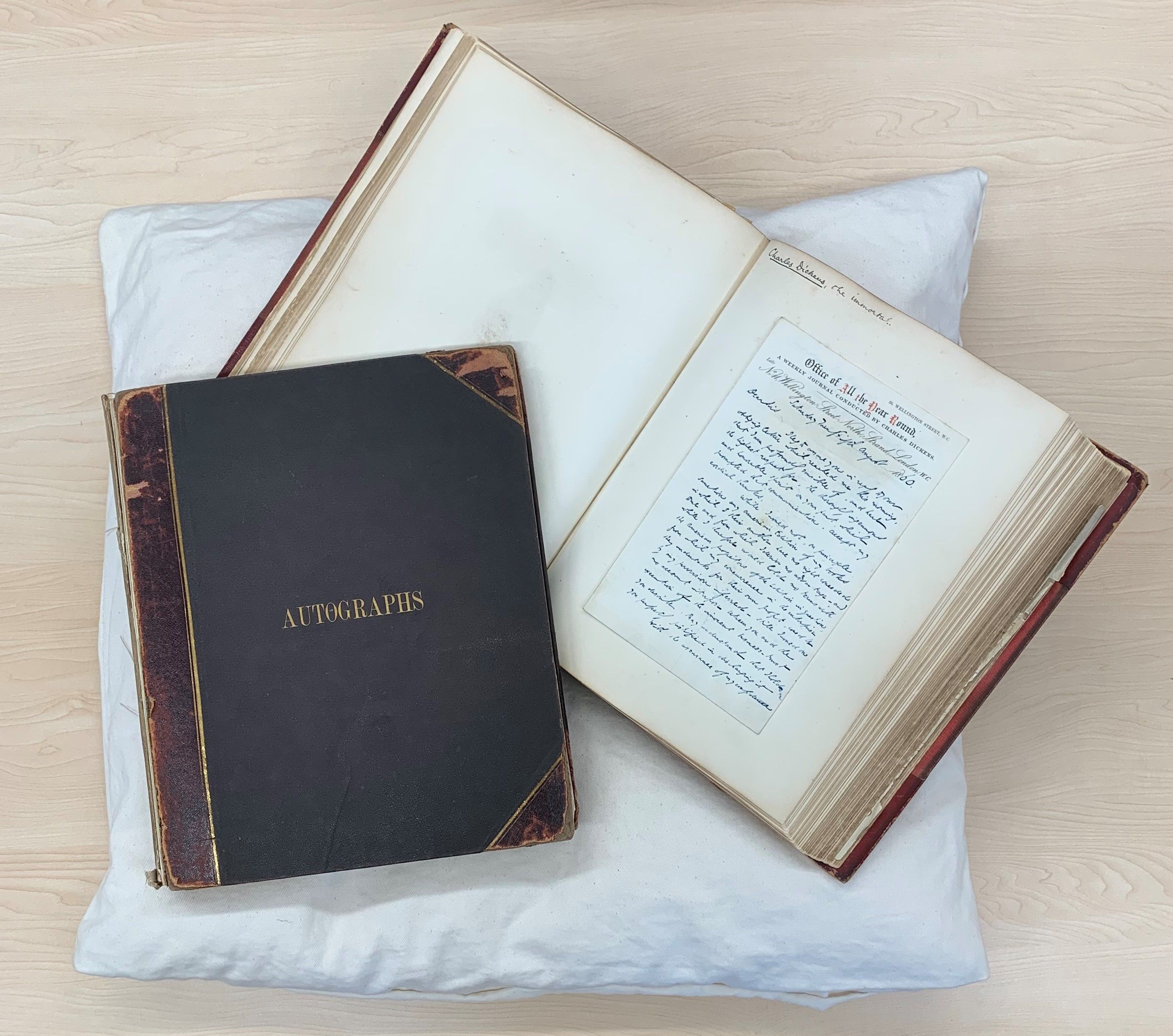 The Sampson Low Collection - a collection of more than 200 letters written by clients and contemporaries of the publisher Sampson Low, preserved in two volumes. The letters date between 1828 and 1877. This image shows one volume open to display a letter from Charles Dickens.