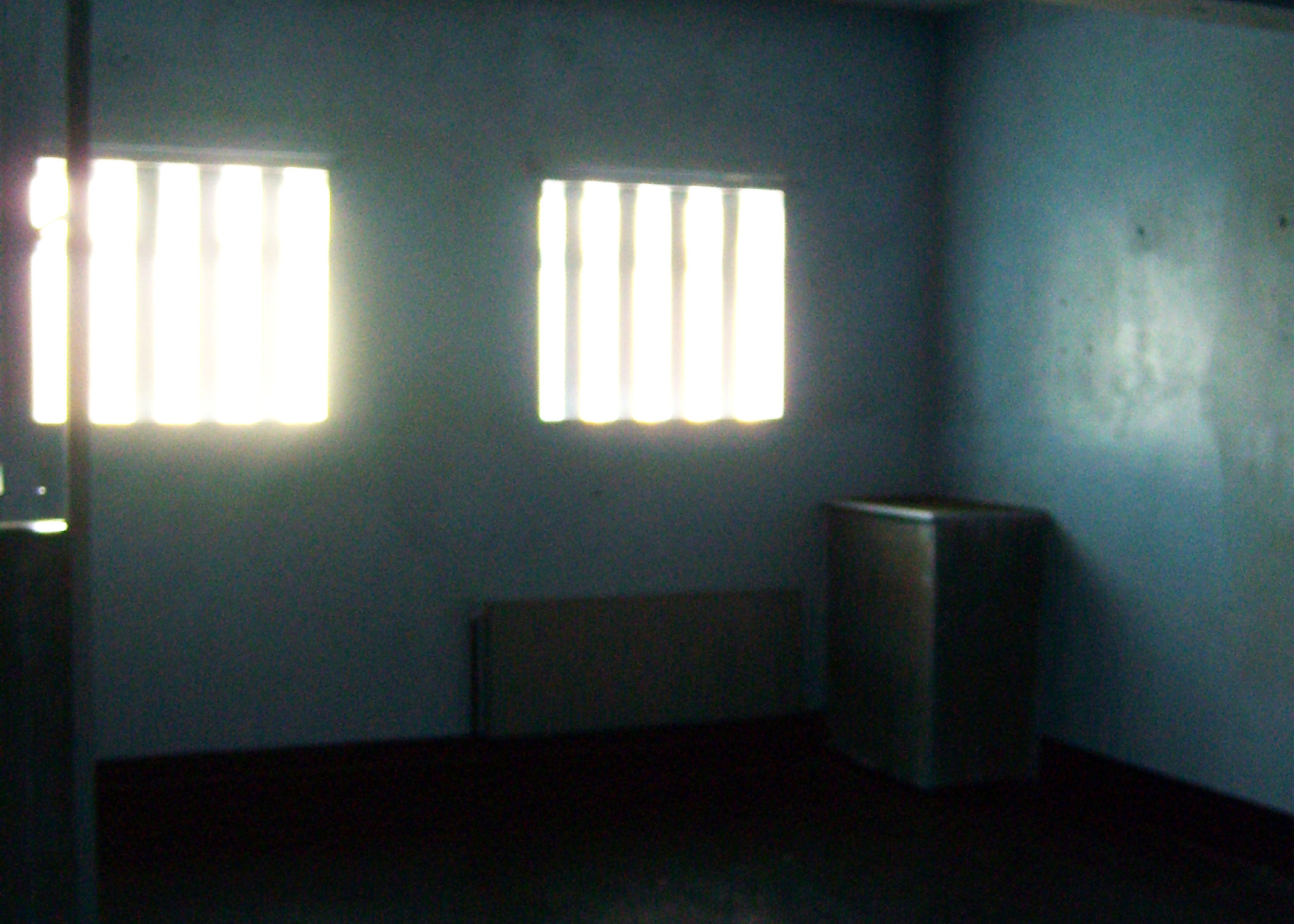 A photograph by Lorcan Fairmichael taken at the Maze and Long Kesh Prison site in 2011. The image shows an interior room in the H Blocks with a desk blue walls and bright sunlight shining through two cell windows with bars.