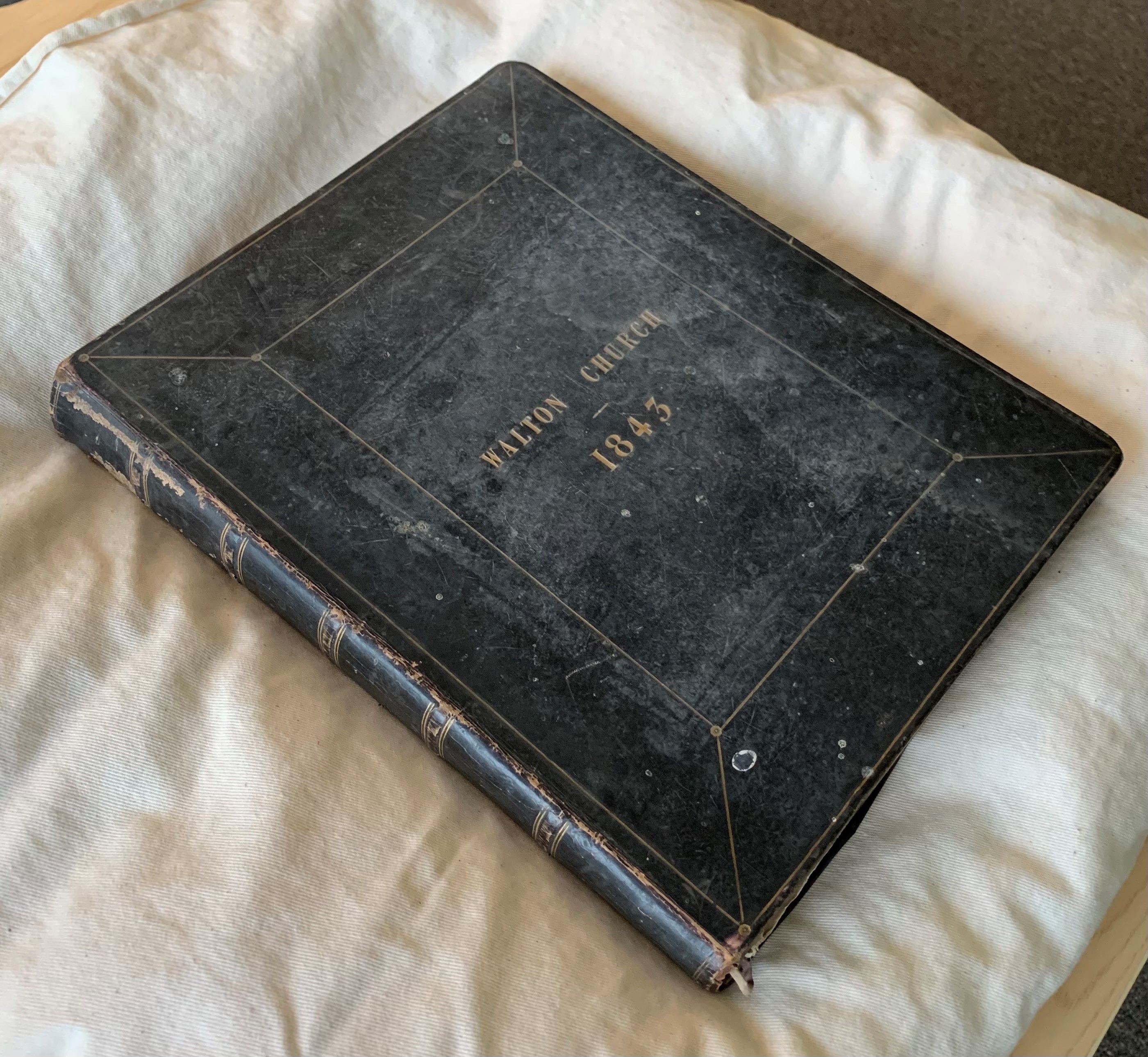 This leather bound church communion and services book was retrieved from St Michael's Church, Walton Hall during the 1970s. It was printed in 1843 by John Collingwood and Co. Today it is held in The Open University Archive.