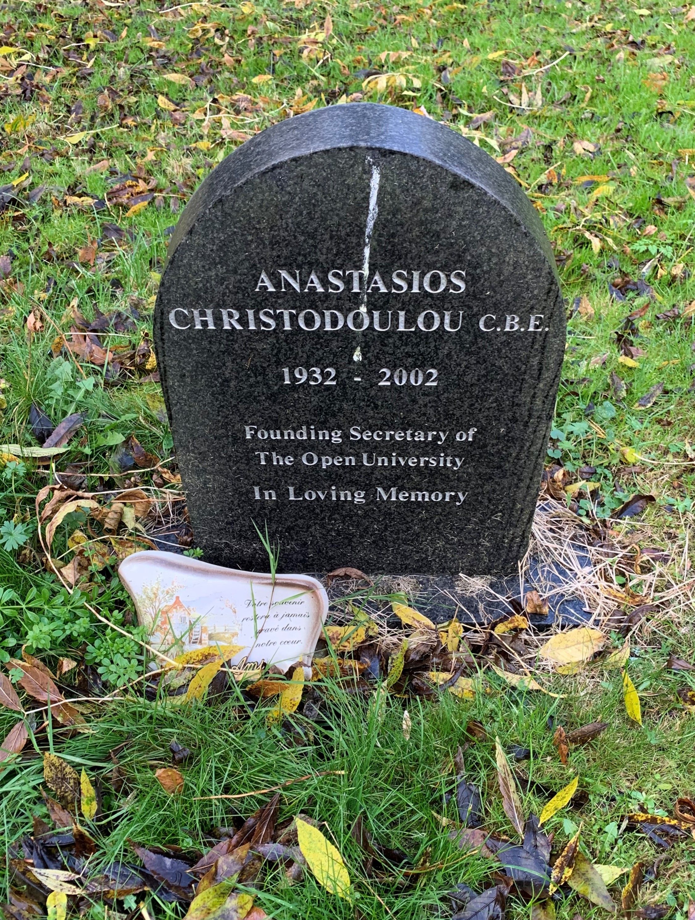 The grave of Anastasios Christodoulou in St Michael's churchyard, Walton Hall, photographed in 2021. Christodoulou was the first Secretary of The Open University.