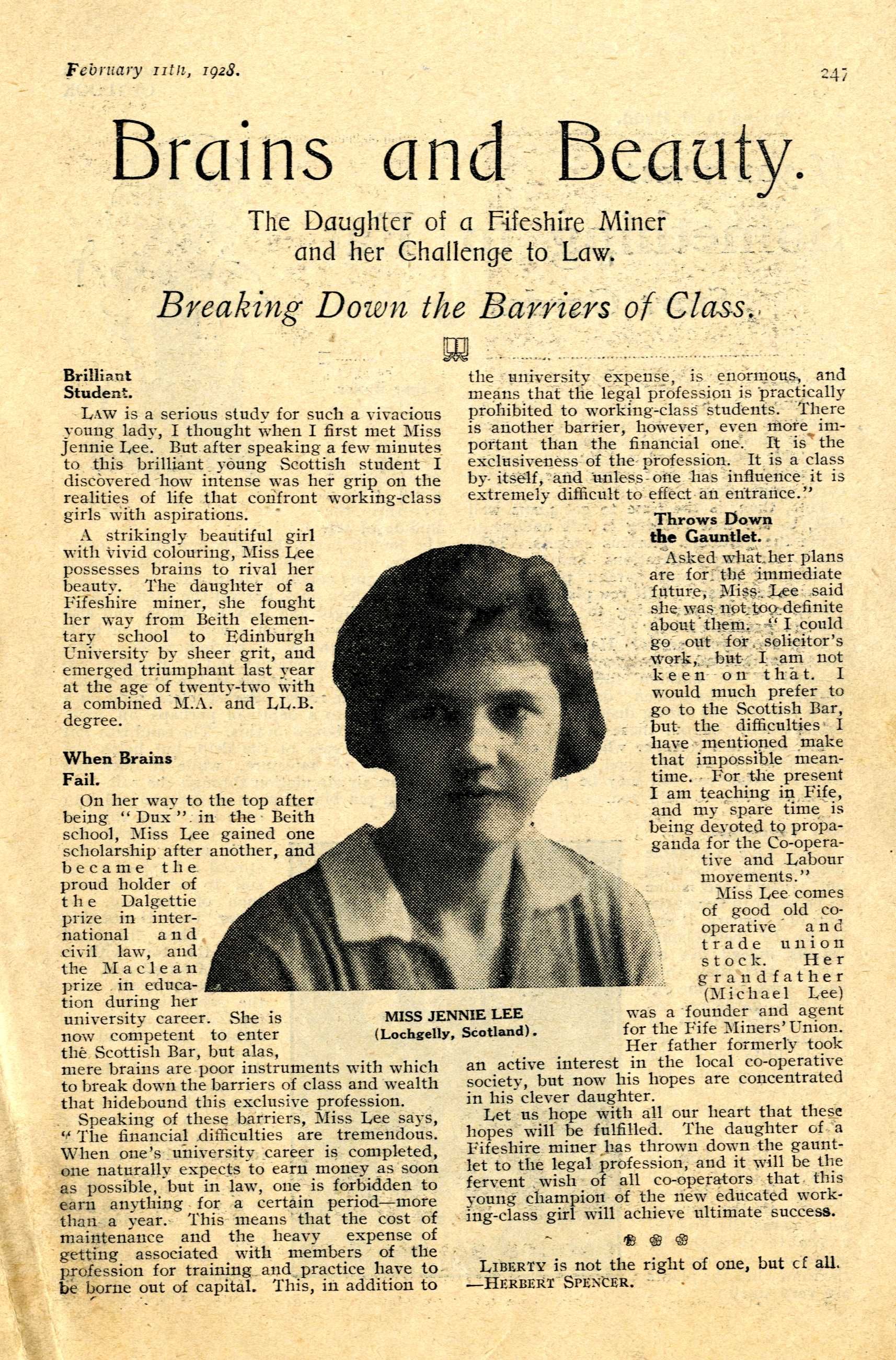 An article dated 11th February 1928, written about Jennie Lee when she was considering a career in Law.