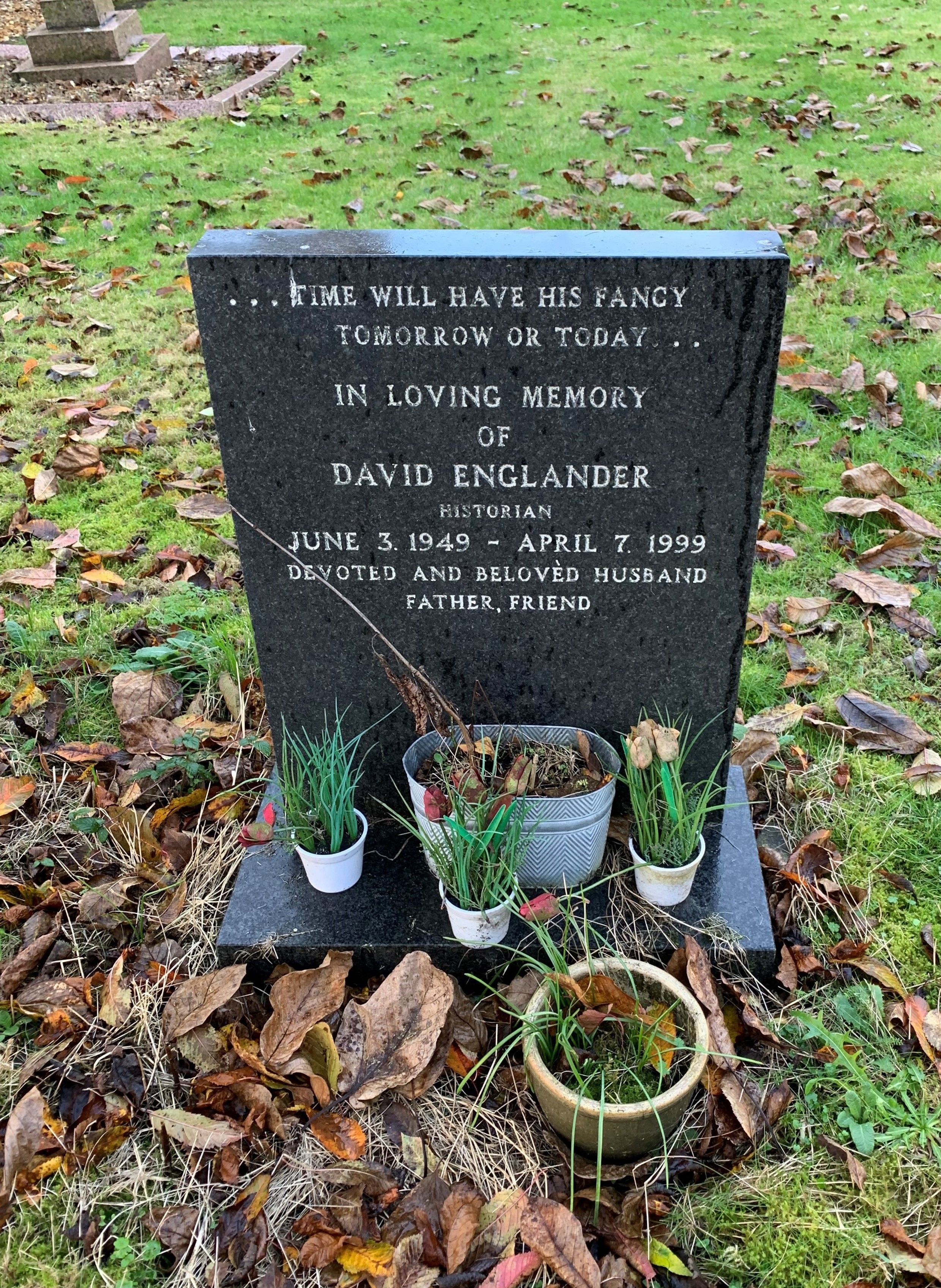 The grave of historian David Englander in St Michael's churchyard, Walton Hall, photographed in 2021. He worked at The Open University from 1979 until his death in 1999.