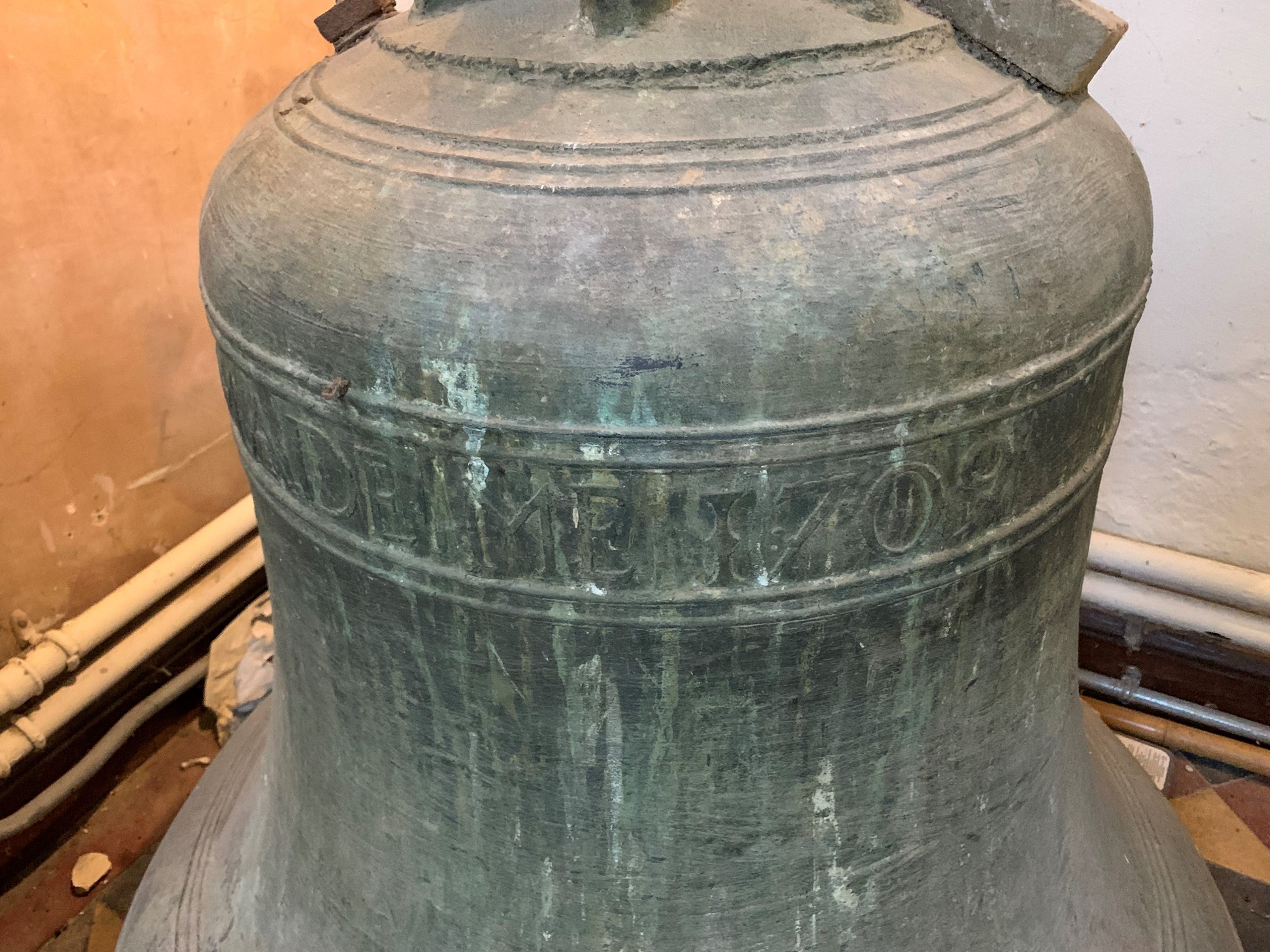 This tenor bell was cast and hung in St Michael's Church in 1709 by brothers Richard and George Chandler. It was removed from the bell tower in the 1970s. The image shows a close up of part of the inscription on the bell - "Chandler made me 1709".