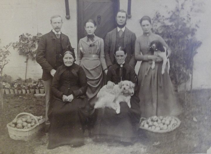 Photograph of members of the Lightfoot family outside The Pine Tree Inn, c.1891-1892. The Lightfoots were the proprietors of The Pine Tree Inn (owned by the Pinfolds) which once stood close to Walton Manor on the Walton estate. The image shows William Lightfoot standing behind his wife Elizabeth with a dog on her lap. Standing beside him from L to R are Thomas Bonner (nephew) Ellen Frances and Margaret Lightfoot (daughters). Elizabeth Lightfoot's mother Elizabeth Eastman is sitting beside her daughter.