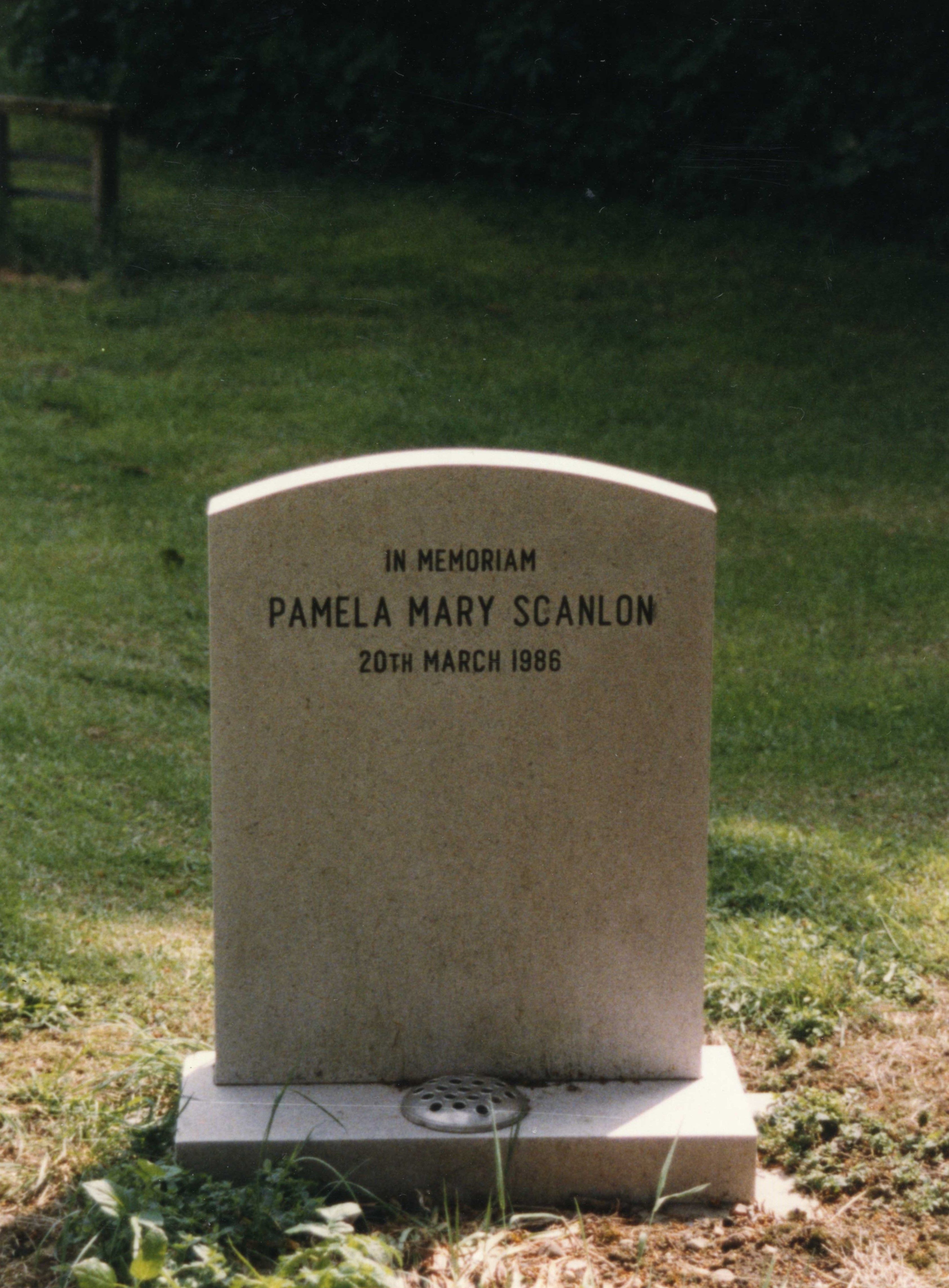 The grave of Pamela Scanlon in St Michael's churchyard, Walton Hall, photographed in 1986. The upright headstone was later replaced by a flat stone.