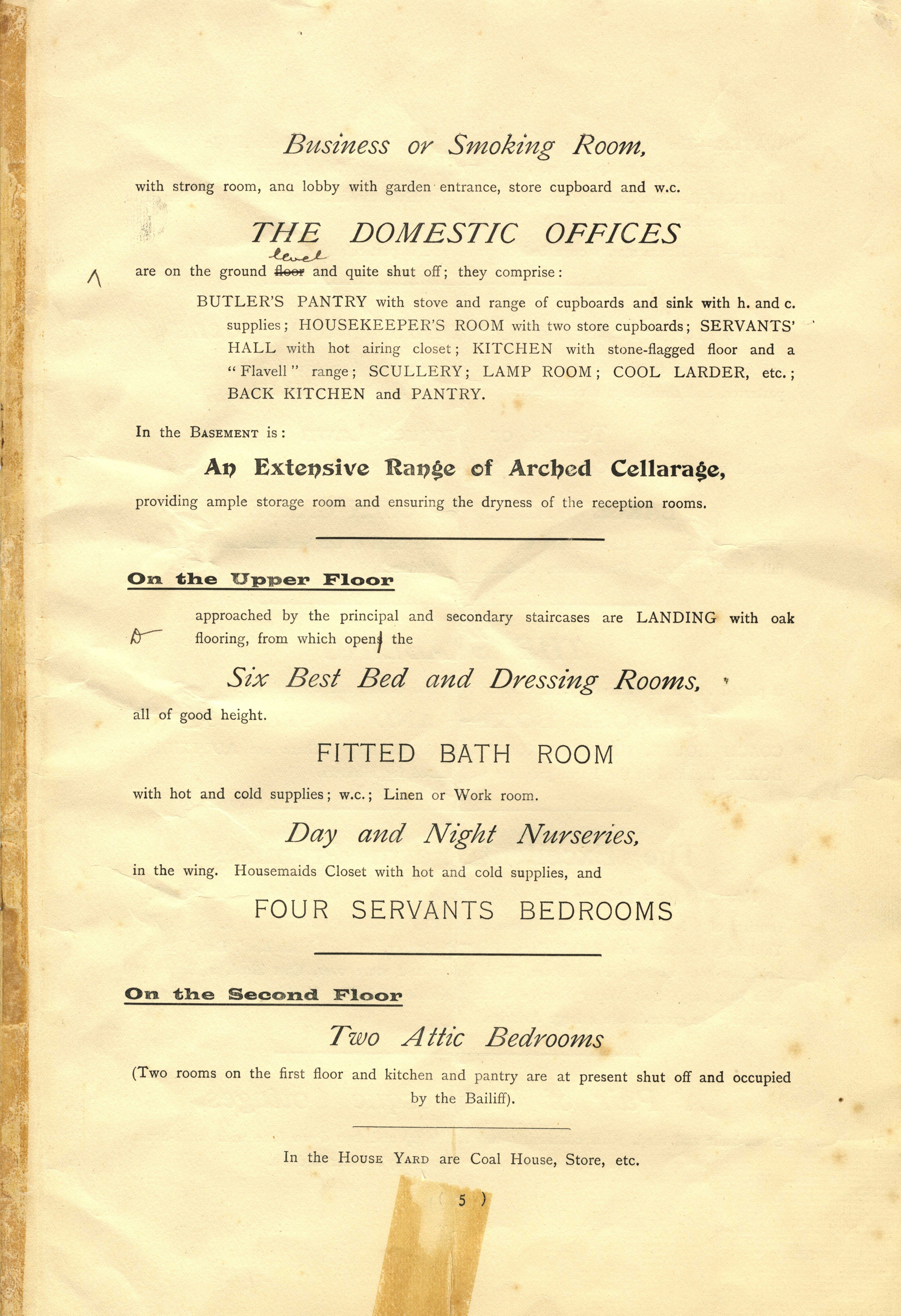 In 1911 the owners of Walton Hall, Dr and Mrs Harley, put the 70 acre estate up for sale. This image is the fifth page of the draft sale document describing aspects of the Hall building's interior including the 'domestic offices' and cellar. The document was produced by auctioneers Hampton & Sons and printed by Howard & Jones Ltd.