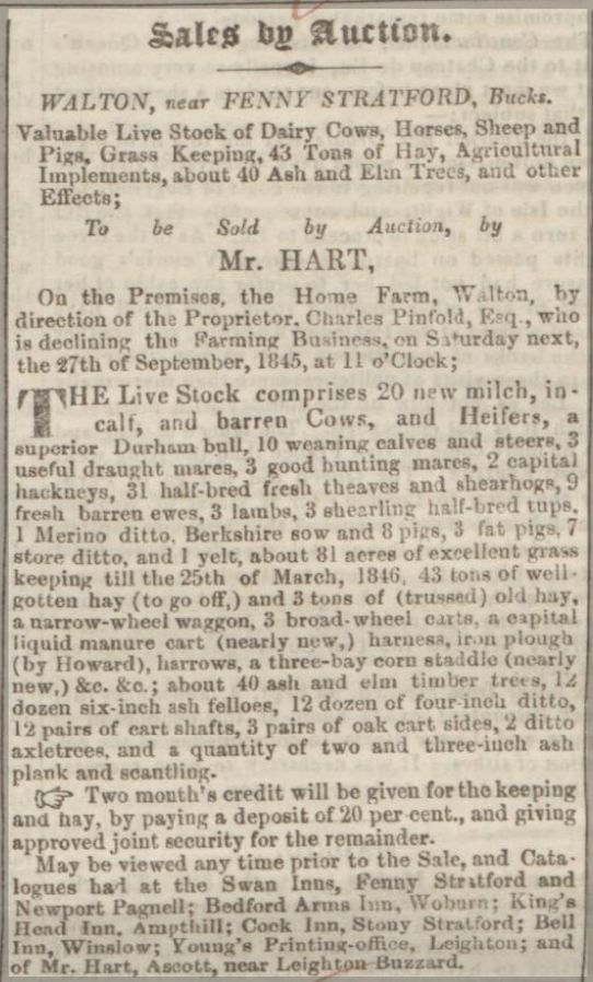 A notice from the 'Bucks Herald' Newspaper, 1845, advertising the sale by auction of farm stock and equipment from the Walton Hall estate.