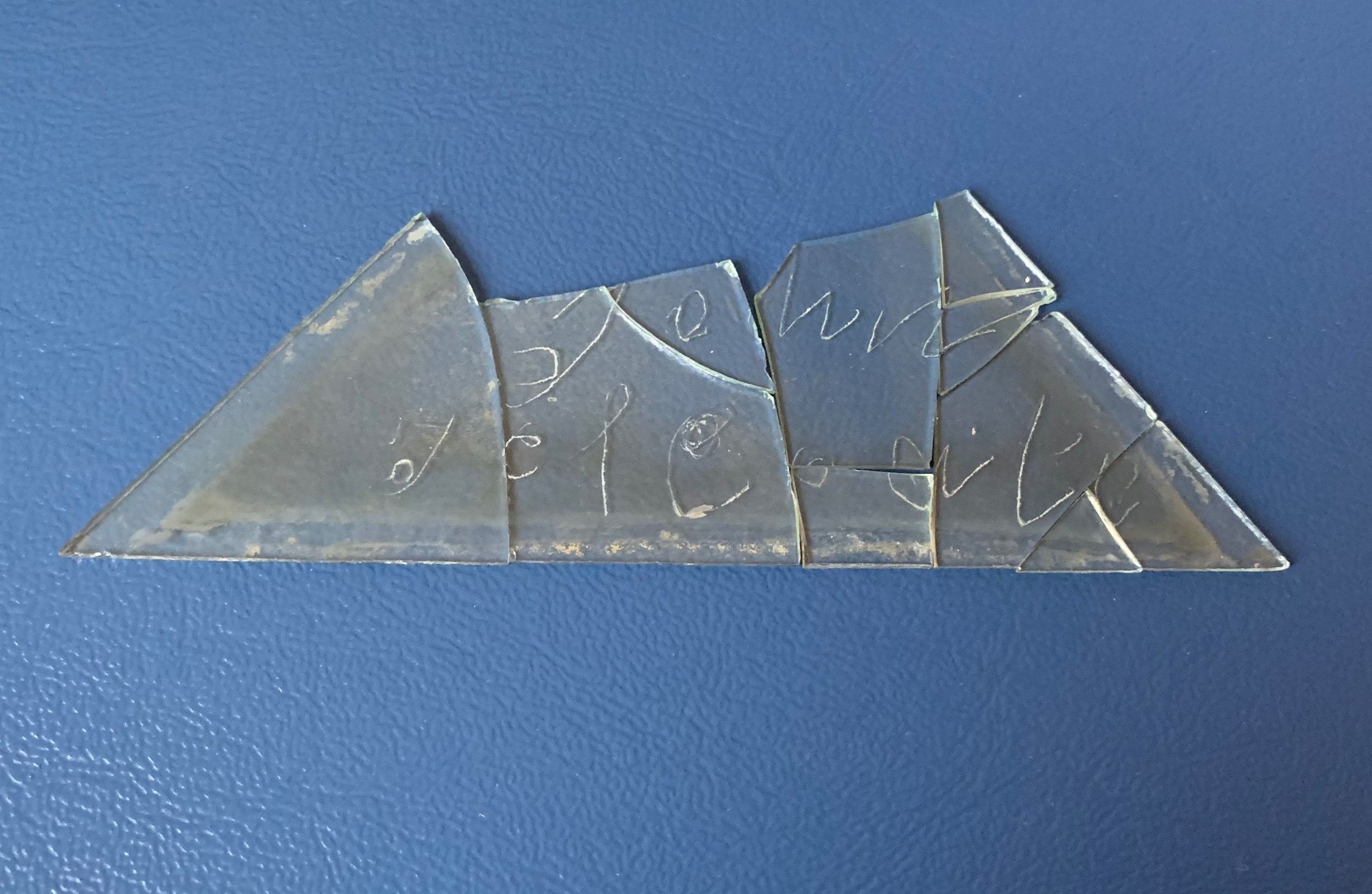 Fragments of window glass recovered from St Michael's Church at Walton Hall in 1976. The signature scratched onto the glass is 'John Jefcoate' who worked as a glazier in the area in 1841.