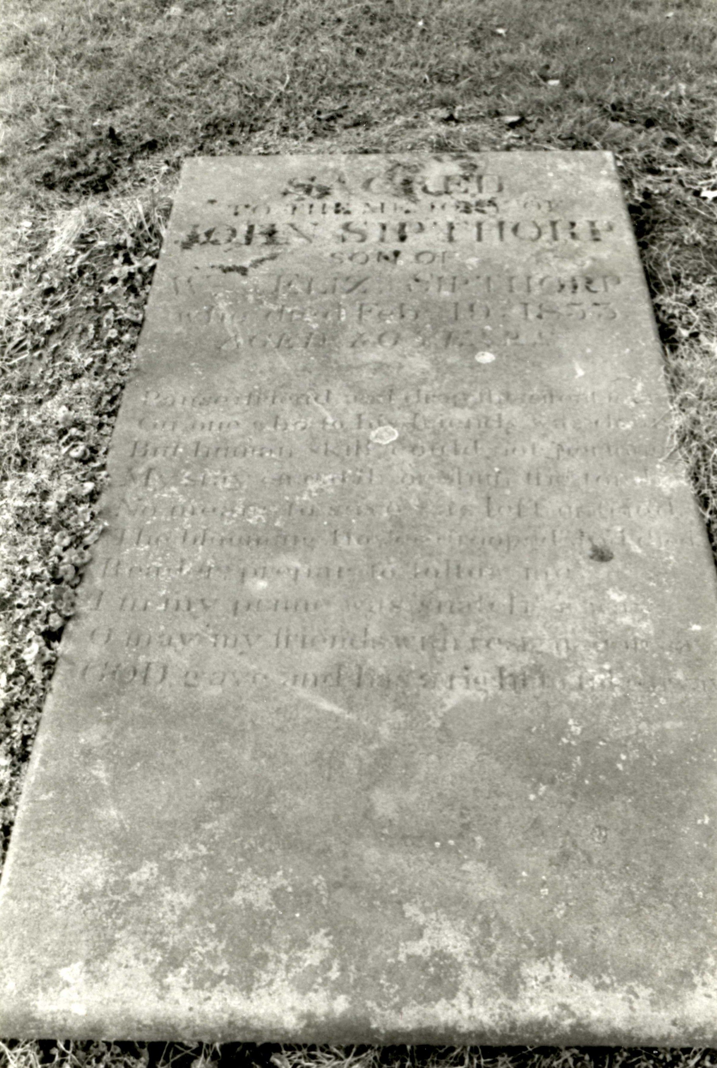 The grave of John Sipthorp in St Michael's churchyard, Walton Hall, photographed in 1986.