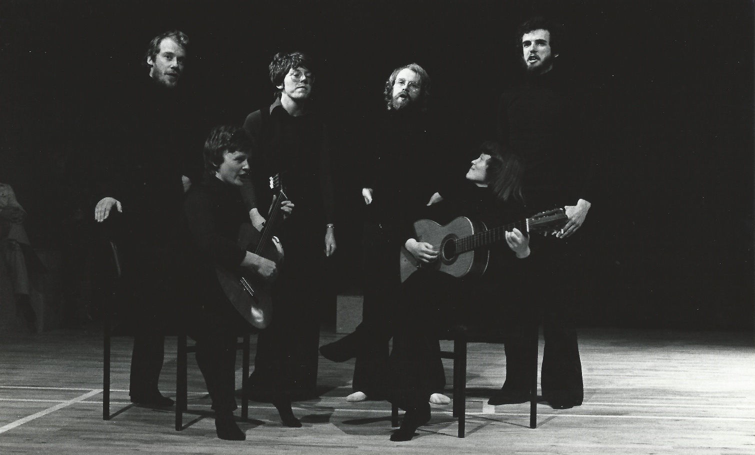 Rehearsals for "The Ballad of Walton Hall", which was written and produced by Peggy Aprahamian for the OU Operatic Society and performed in the OU Lecture Theatre in May 1977. More information on this can be found among the contents of the PhD Pioneers exhibition (https://www.open.ac.uk/library/digital-archive/exhibition/301).