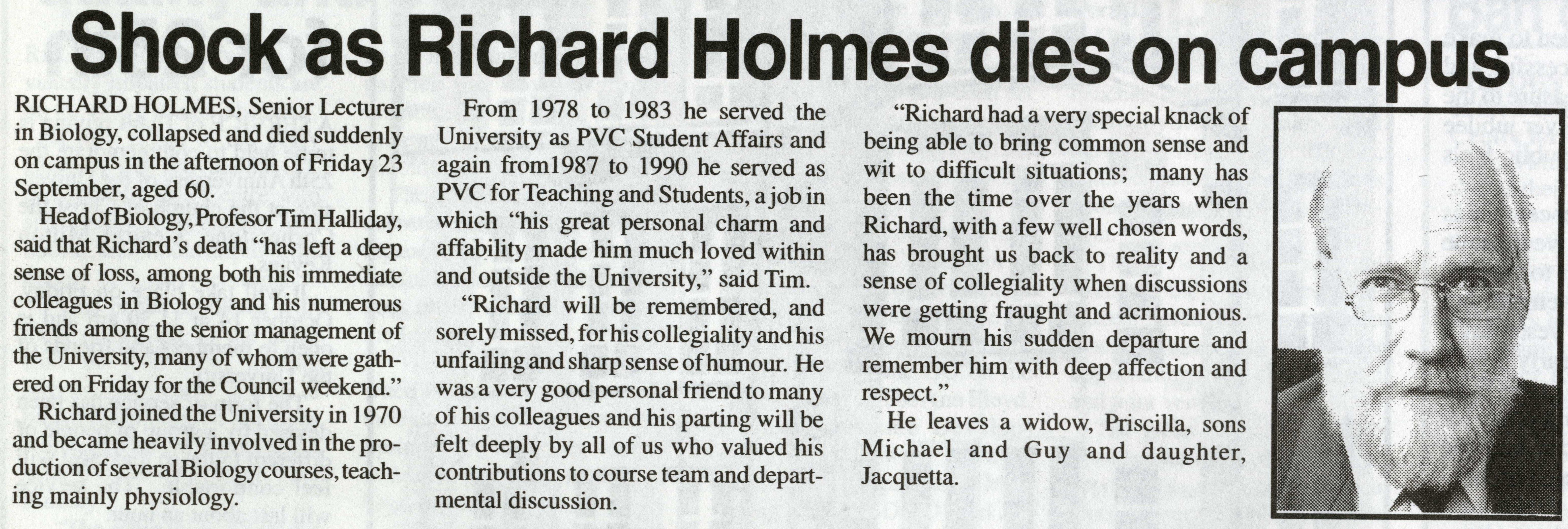 Article from OU staff magazine Open House from 1994: Obituary of biologist Richard Holmes.