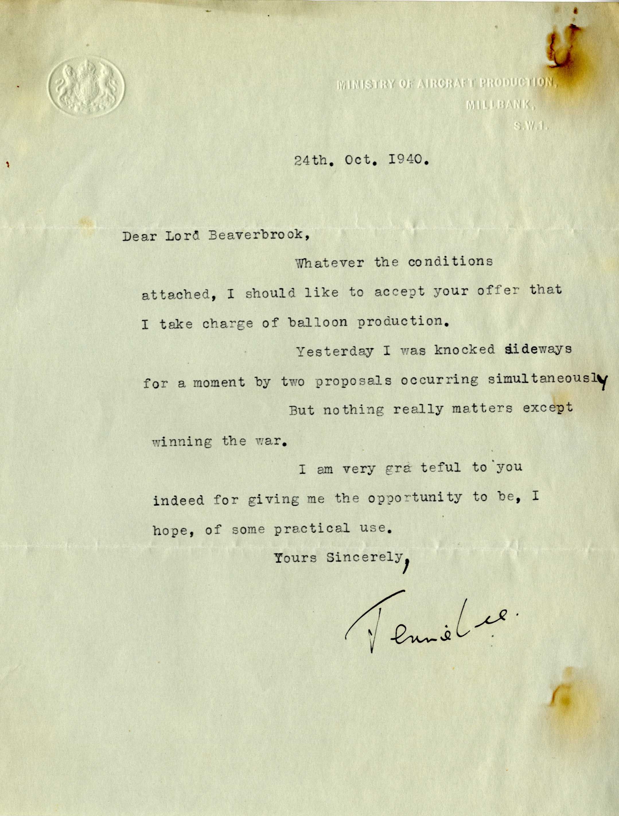 Typed letter from Jennie Lee to Lord Beaverbrook dated 24th October 1940 accepting the job of overseeing barrage balloon production.