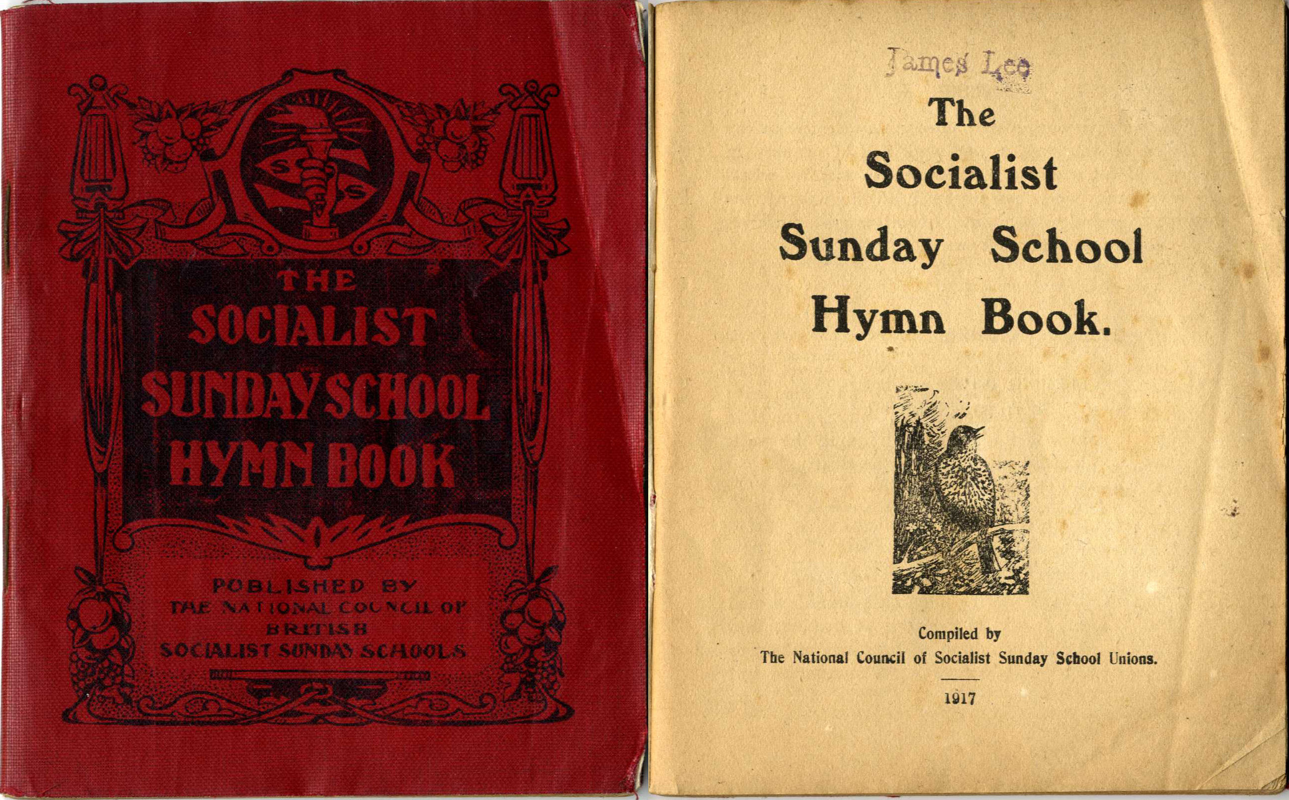 Front cover and inside page of a Socialist Sunday School hymn book belonging to Jennie Lee, passed down from her father James.
