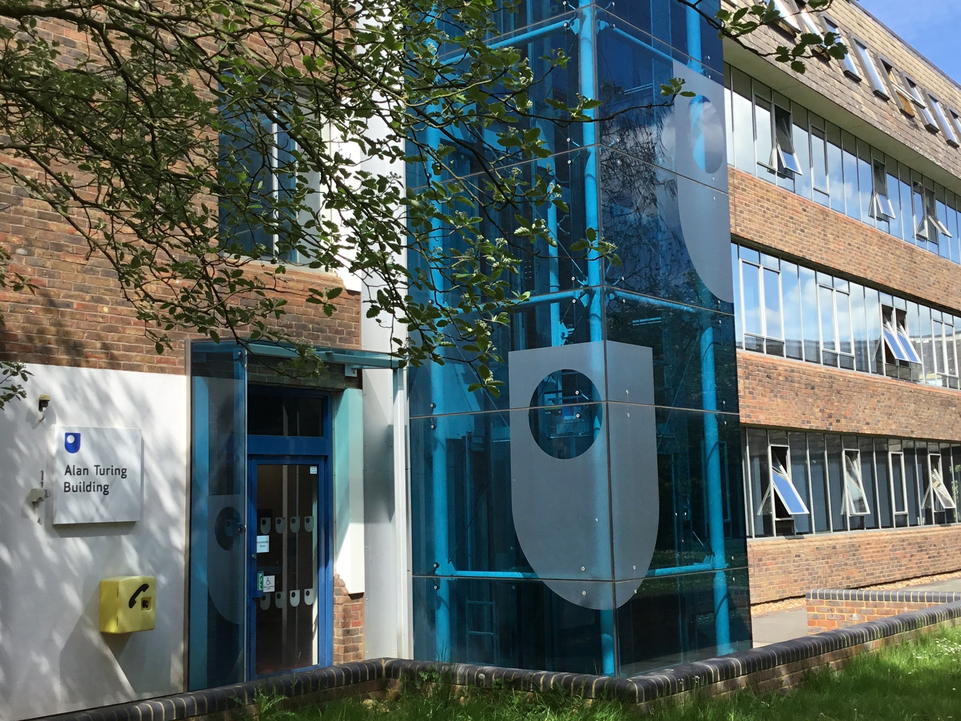 External view of the entrance to the Alan Turing Building on the Open University campus in Milton Keynes. The Building was originally opened as the Mathematics block in 1973. In 2010 it was officially renamed the Alan Turing Building. Alan Turing (1916-1954), described as 'the father of computer science', was a mathematician, logician, cryptanalyst and computer scientist who was a main participant in the code-breaking work at Bletchley Park, not far from the Open University campus.