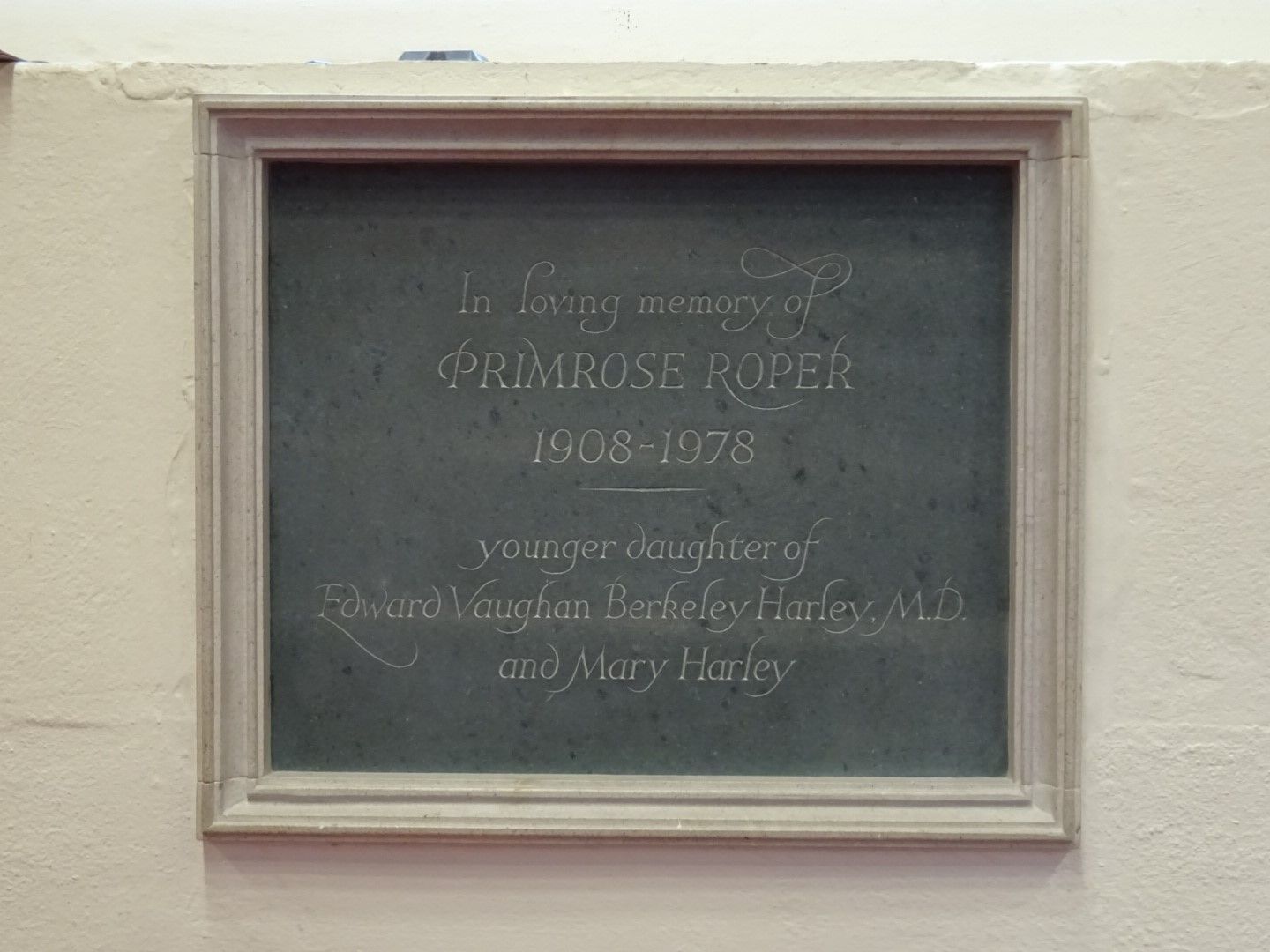 Memorial plaque in St Michael's Church, Walton Hall, to Primrose Roper (1908-1978). Primrose was the youngest daughter of Edward Vaughan Harley who owned Walton Hall in the early part of the 20th century.