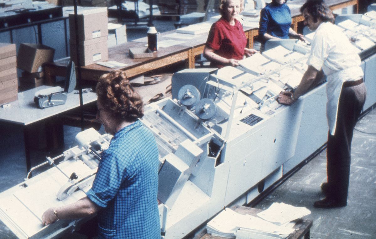 Warehouse staff assembling supplementary study materials to be posted to students.