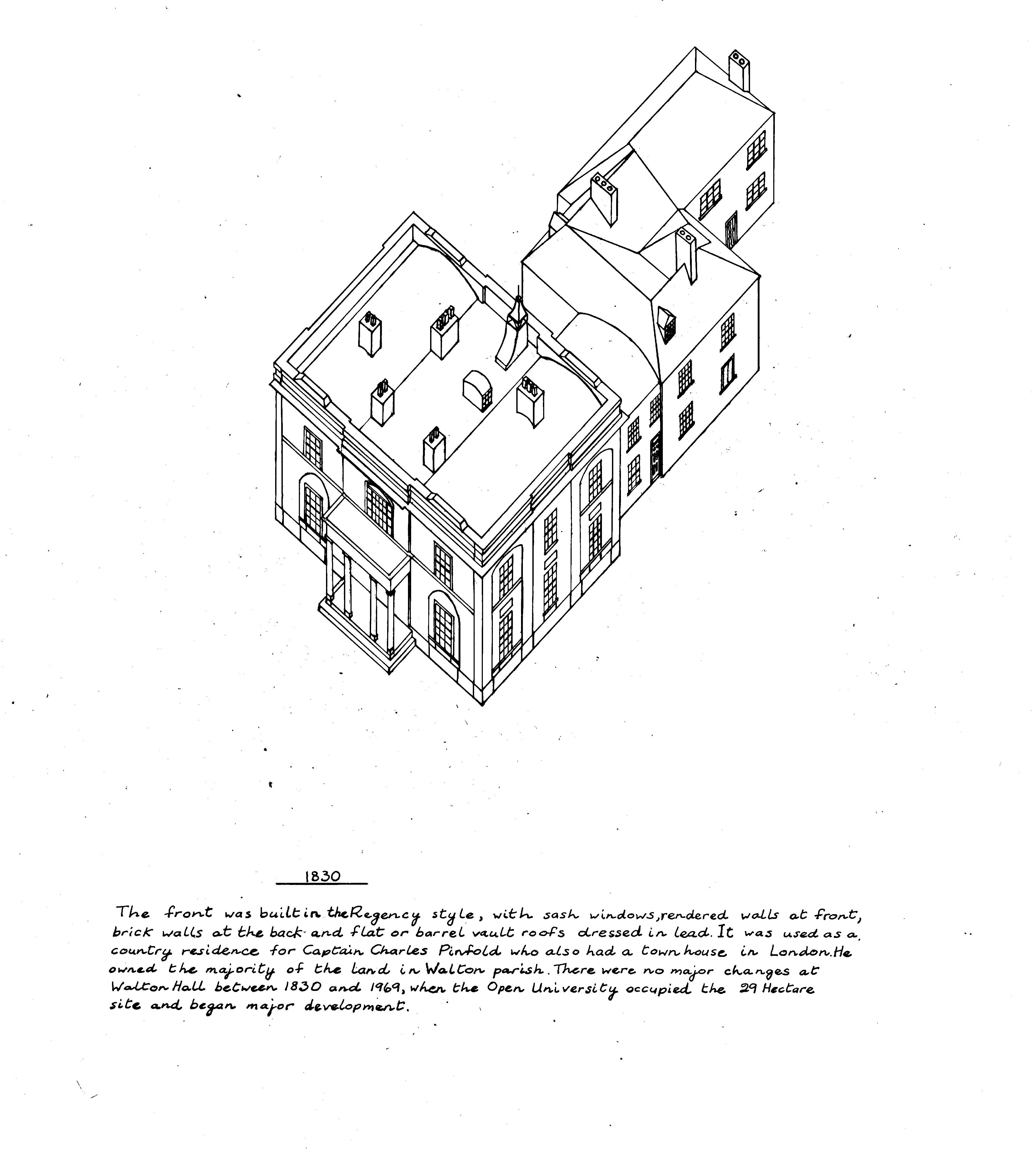 Building elevation diagram of Walton Hall showing how it looked in about 1830 when it was owned by Captain Charles Pinfold. At this time he made the greatest alterations to the Hall. Drawn by David Ball, Estates Assistant Surveyor at The Open University in 1989.