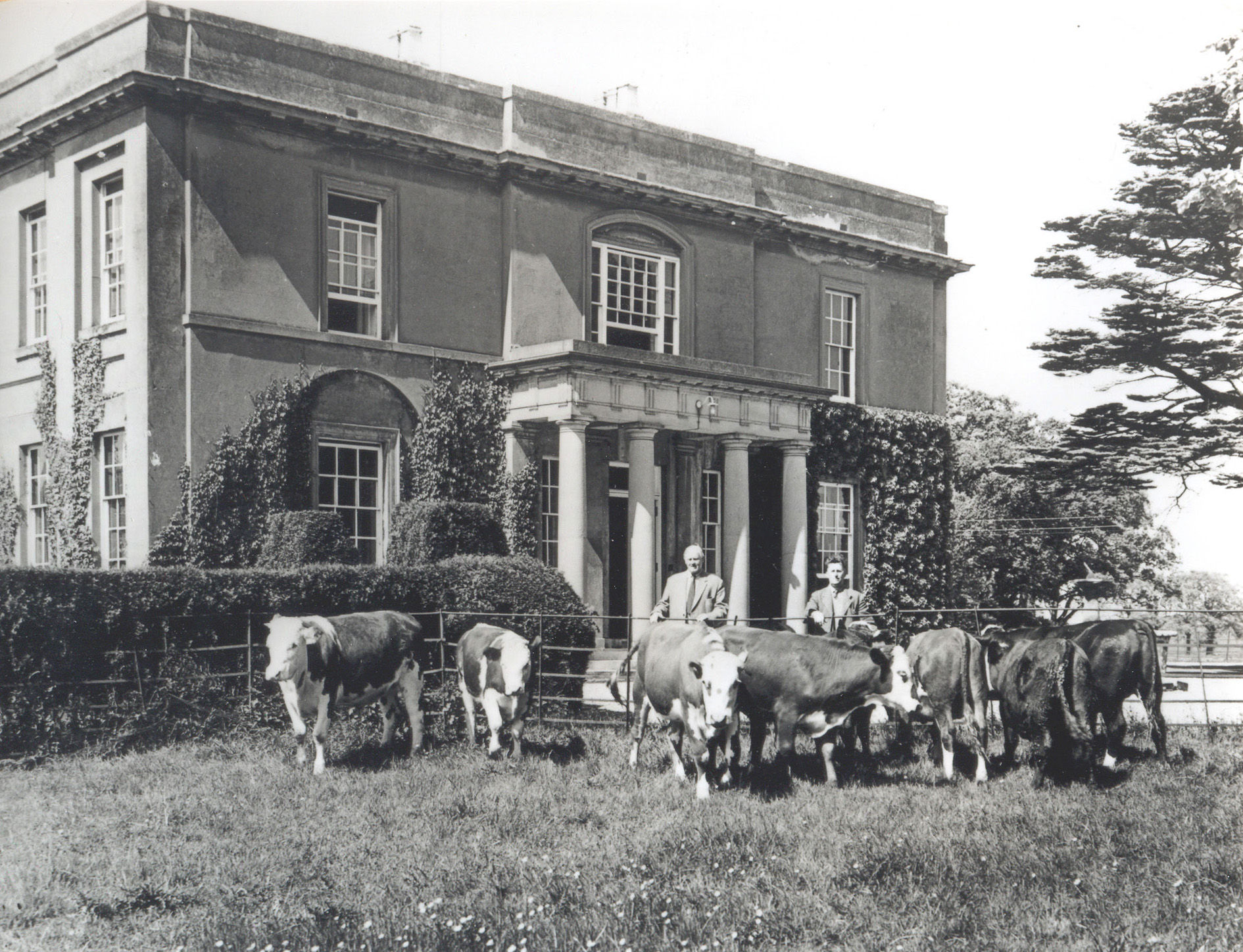 The exact date of this photograph of Walton Hall is unknown but it was probably taken in the late 1950s or early 1960s. The man standing behind the cows to the left is Brigadier Eric Earle who - through his marriage to Diana Harley - owned the estate until his death in 1965. The man on the right is the Earles' farm manager, Mr. Brown.