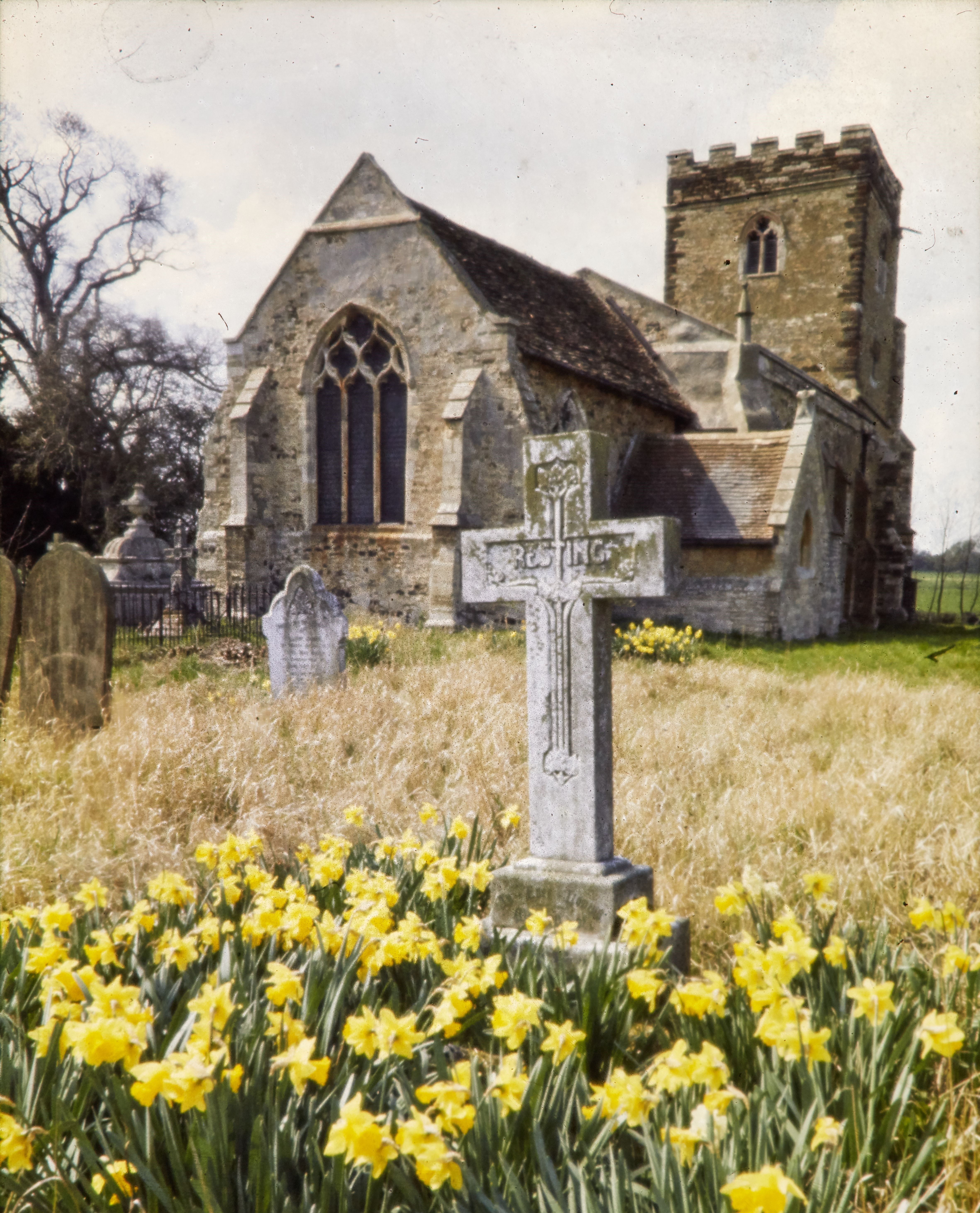The grave of George and Priscilla Underwood with St Michael's Church behind, photographed in about 1970 when The Open University first took over the Walton Hall estate.