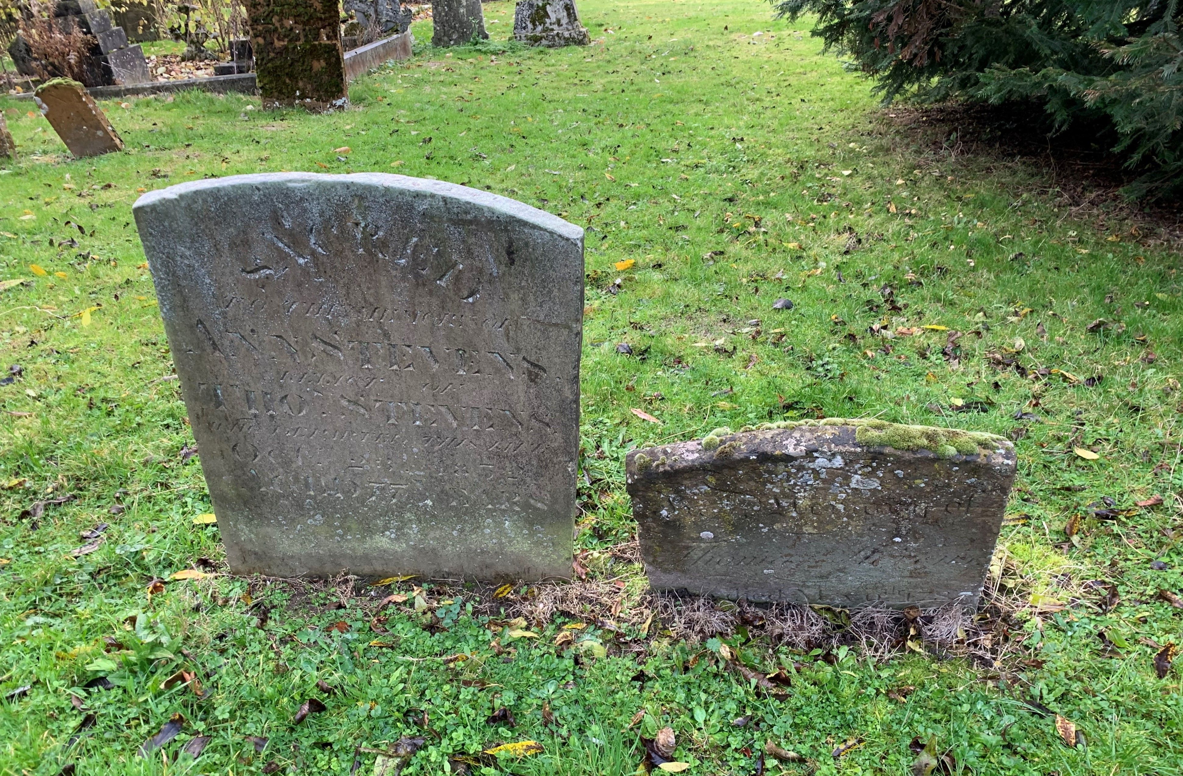 The graves of Ann and Thomas Stevens in St Michael's churchyard, Walton Hall, photographed in 2021.
