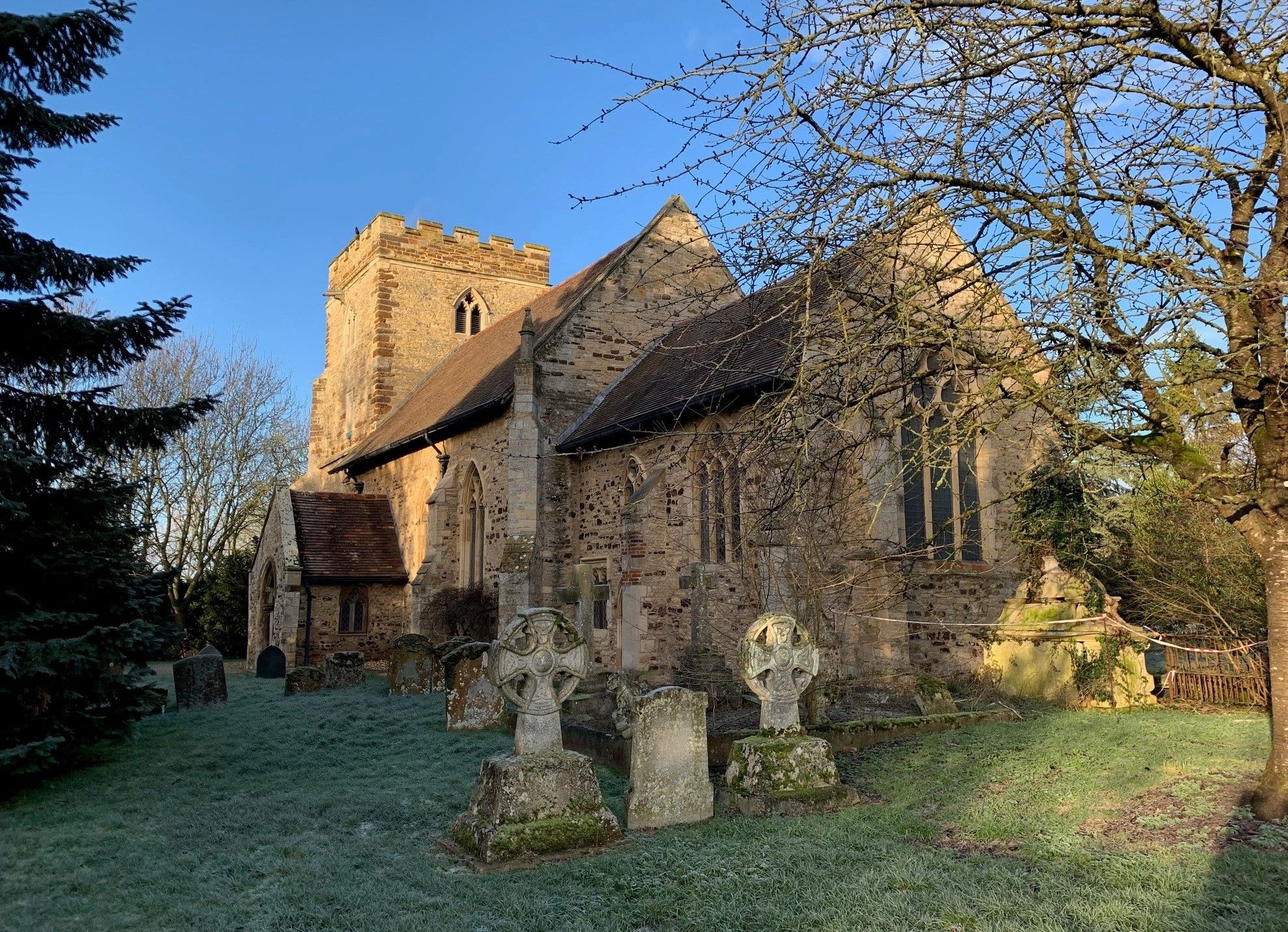 St Michael's Church photographed in January 2023. The three graves in the foreground belong to (from L to R) Brigadier Eric and Diana Earle (née Harley), Lizzie Isabella Earle (with a commemoration to her husband Cecil Earle who died abroad) and Primrose Roper (née Harley).