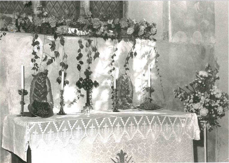 Harvest Festival altar display in St Michael's Church, Walton Hall c.1970. The last service was held in the church in 1974 before the church underwent extensive restoration work by The Open University.