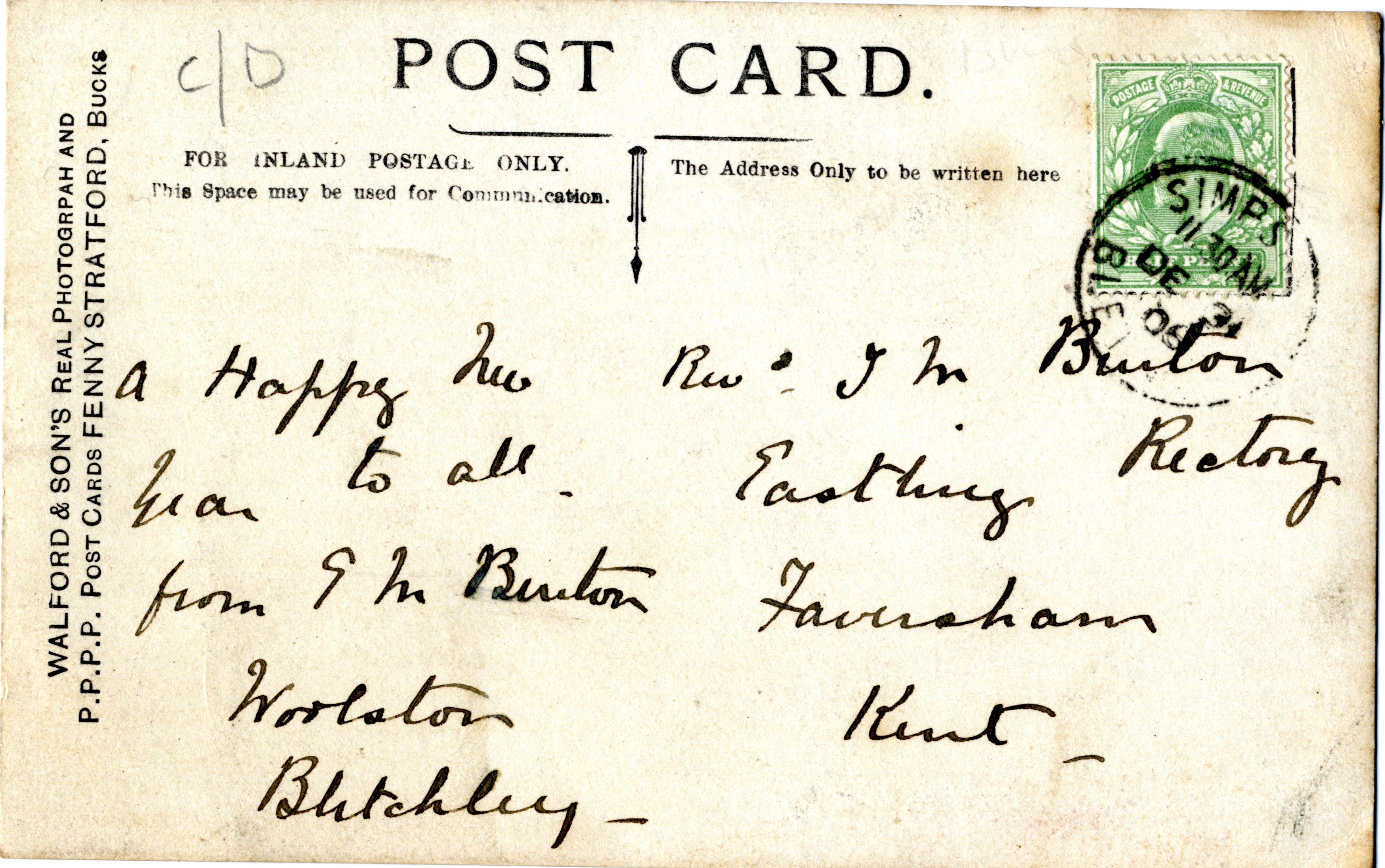 Reverse of a 1906 postcard of Walton Hall sent by Elizabeth Musgrave Burton family to her brother Rev. Thomas Musgrave Burton. The Burton family were tenants of Walton Hall from the mid 1860s to around 1890.