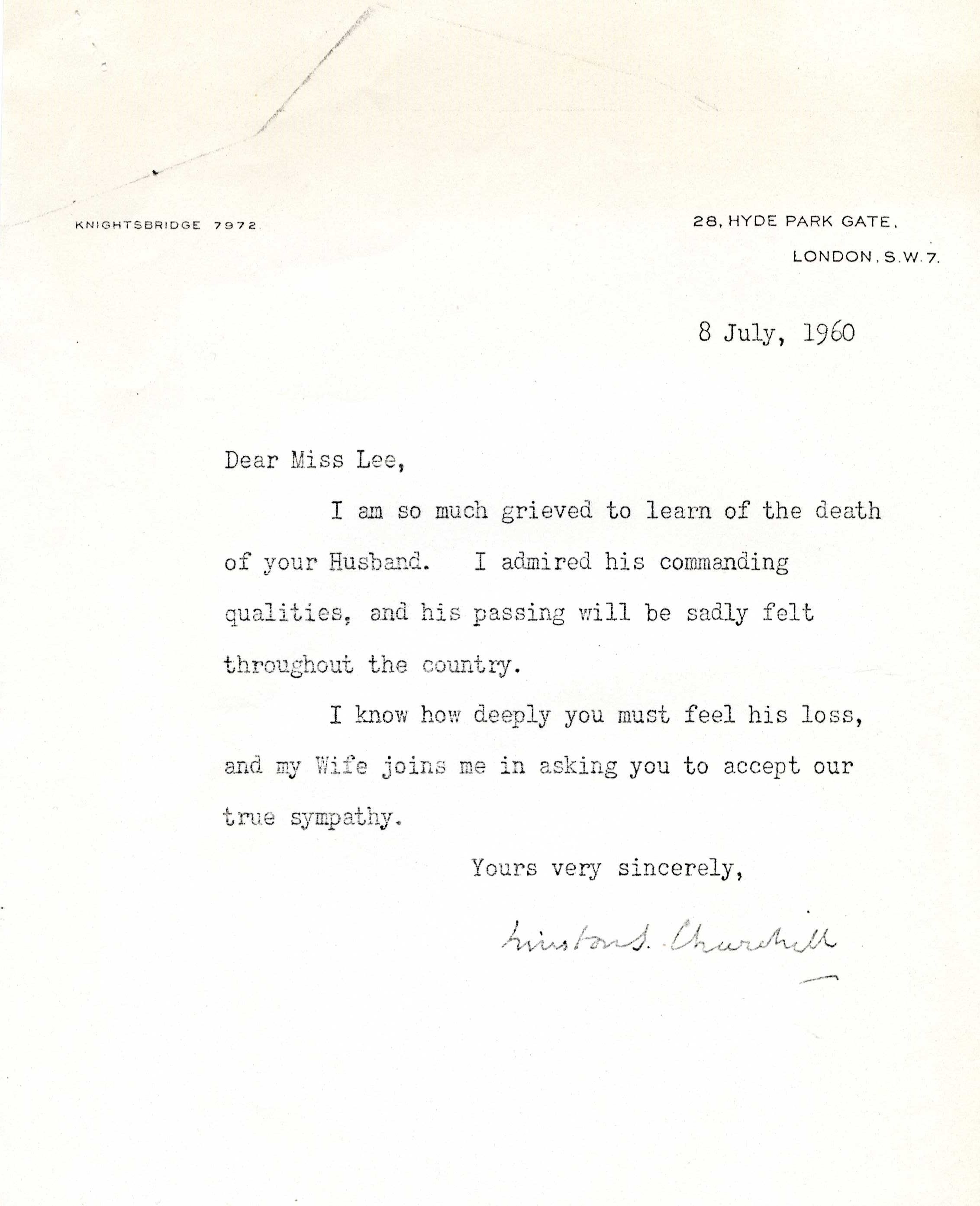 Typed letter of sympathy from Winston Churchill to Jennie Lee dated 8th July 1960 following the death of Aneurin Bevan.