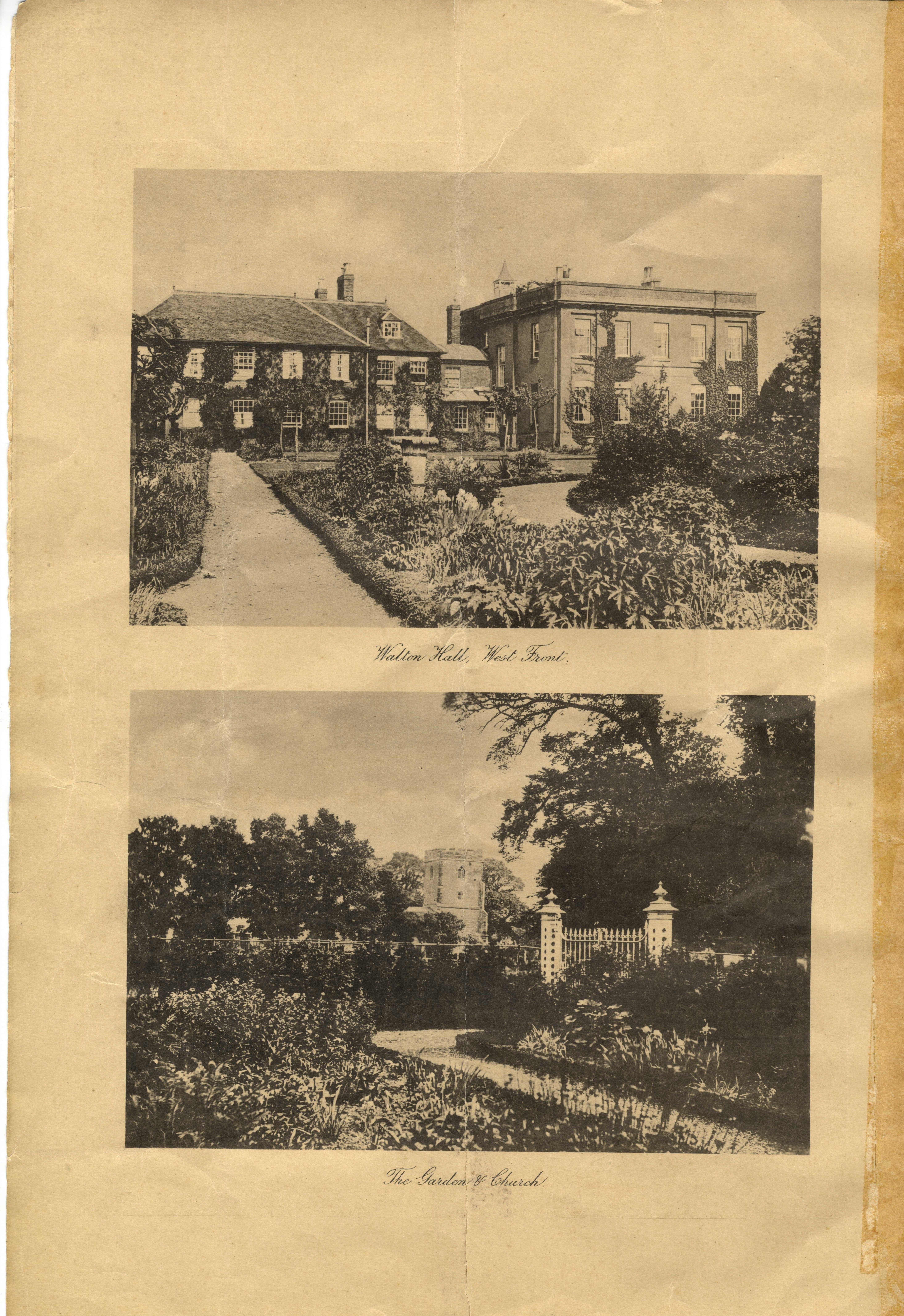 Photographs of Walton Hall included in a 1911 sale document for the estate: St Michael's Church with one of Walton Hall's gardens in the foreground (close to where the Mulberry lawn is located) and Walton Hall from the garden (now the Mulberry Lawn).