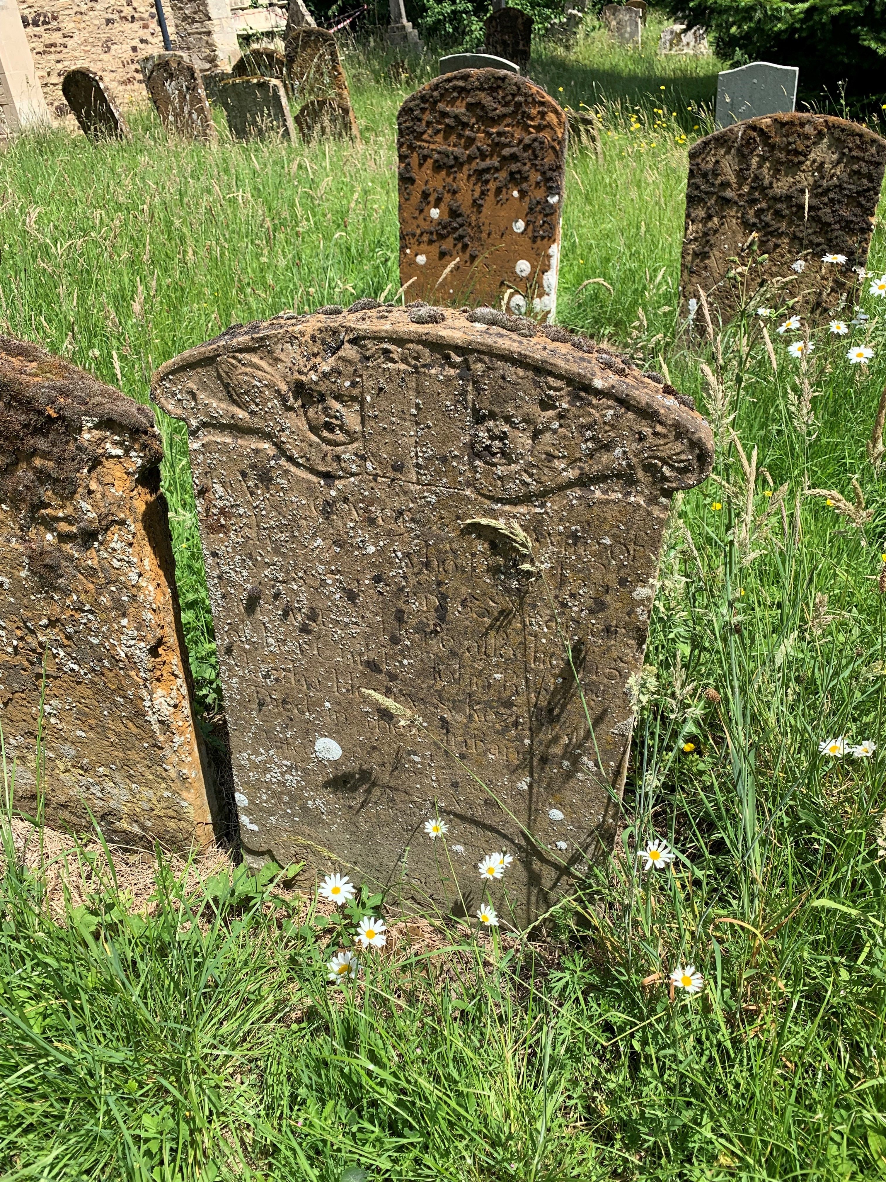 The grave of Amey Smith and five of her children in St Michael's churchyard, Walton Hall, photographed in 2021. This is one of the oldest headstones in the churchyard which is still partly legible - Amey Smith was buried in 1745.