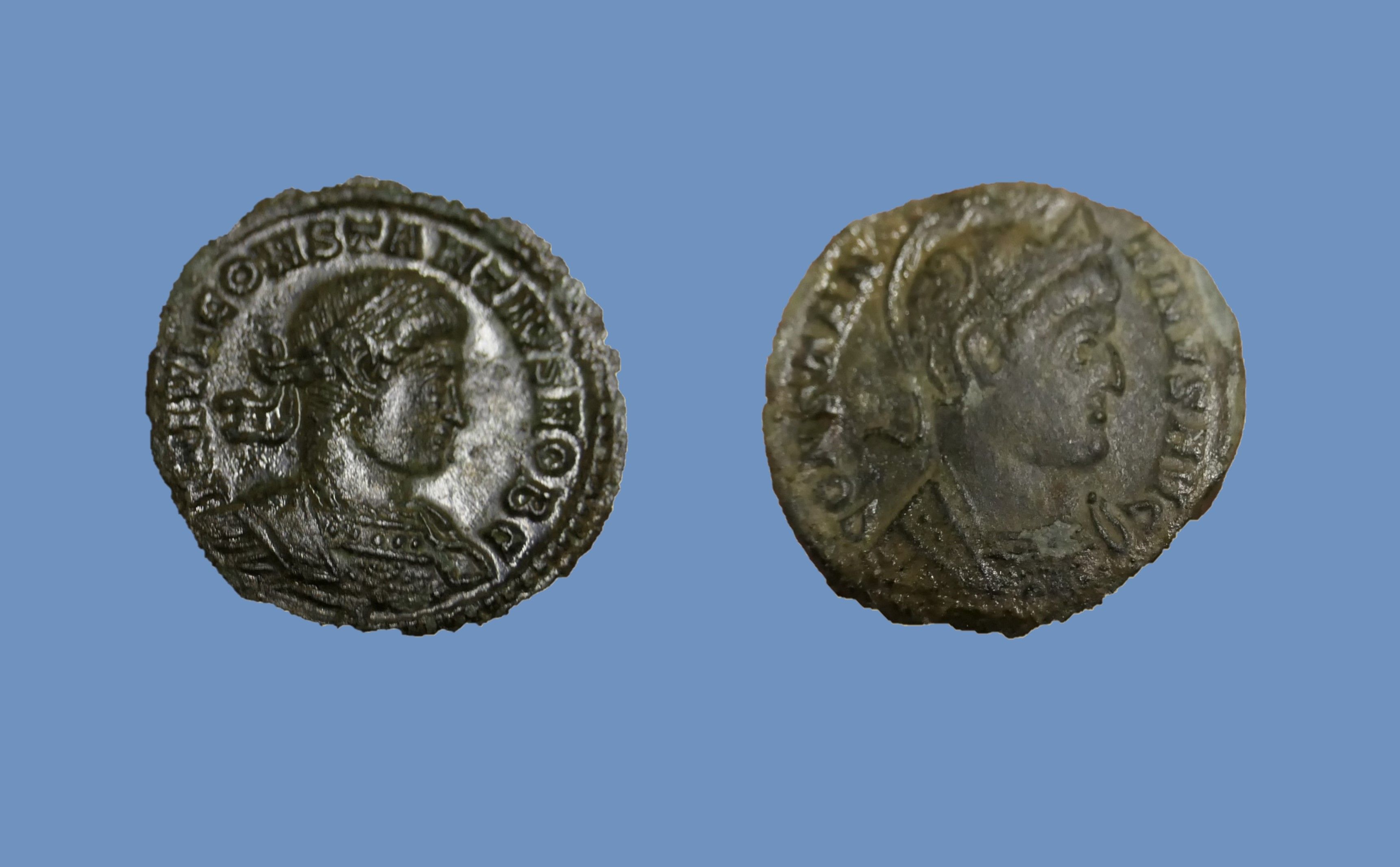 This image shows two Roman coins found in November 1990 when an archaeological evaluation was carried out on the grounds of The Open University campus where the Michael Young building was later constructed in 2001. The coins are both from the reign of the Emperor Constantine (AD 280-337) and are now archived at Milton Keynes Museum.